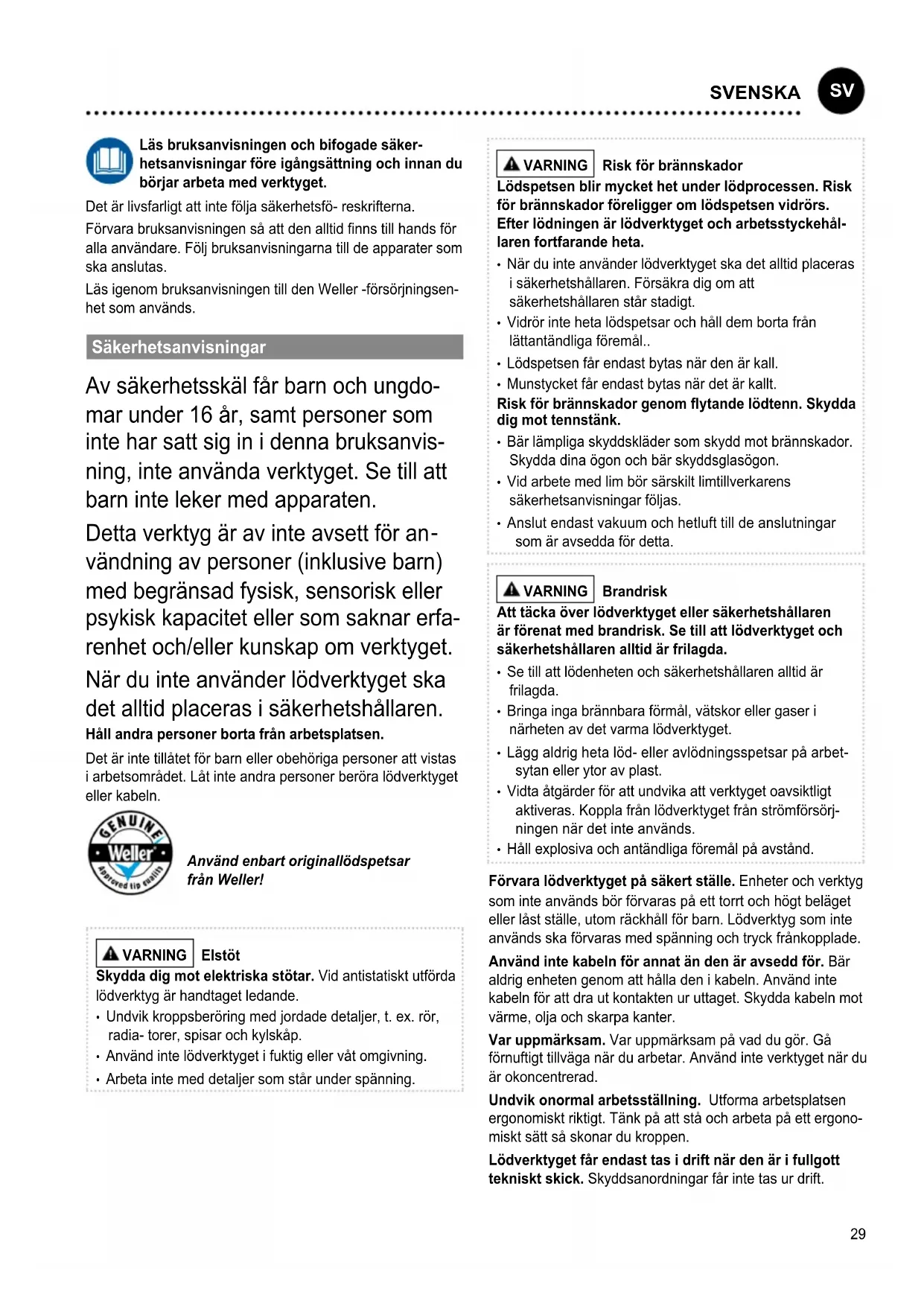vändning av personer (inklusive barn) med begränsad fysisk, sensorisk eller psykisk kapacitet eller som saknar erfa- renhet och/eller kunskap om verktyget. När du inte använder lödverktyget ska det alltid placeras i säkerhetshållaren. Håll andra personer borta från arbetsplatsen. Det är inte tillåtet för barn eller obehöriga personer att vistas i arbetsområdet. Låt inte andra personer beröra lödverktyget eller kabeln. Använd enbart originallödspetsar från Weller! VARNING Elstöt Skydda dig mot elektriska stötar. Vid antistatiskt utförda lödverktyg är handtaget ledande.