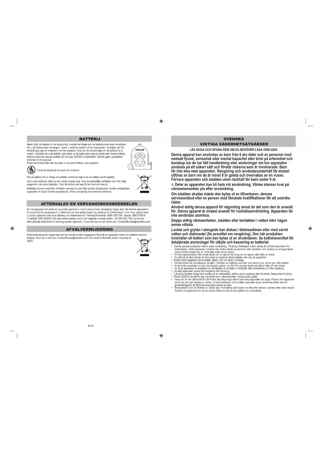 LÄS NOGA OCH SPARA DEM OM DU BEHÖVER LÄSA DEM IGEN Denna apparat kan användas av barn från 8 års ålder och av personer med nedsatt fysisk, sensorisk eller mental kapacitet eller brist på erfarenhet och kunskap om de har fått handledning eller anvisningar om hur apparaten används på ett säkert sätt och förstår riskerna som är involverade. Barn får inte leka med apparaten. Rengöring och användarunderhåll får endast utföras av barn om de är minst 8 år gamla och övervakas av en vuxen. Förvara apparaten och sladden utom räckhåll för barn under 8 år. Delar av apparaten kan bli heta vid användning. Värme stannar kvar på värmeelementets yta efter användning. Om sladden skadas måste den bytas ut av tillverkaren, dennes serviceombud eller en person med liknande kvalifikationer för att undvika risker. Använd aldrig denna apparat till någonting annat än det som den är avsedd för. Denna apparat är endast avsedd för hushållsanvändning. Apparaten får inte användas utomhus. Doppa aldrig värmeenheten, sladden eller kontakten i vatten eller någon annan vätska. Locket och grytan i stengods kan diskas i diskmaskinen eller med varmt vatten och diskmedel (Se avsnittet om rengöring). Den här produkten innehåller ett batteri som kan bytas ut av användaren. Se batteriavsnittet för detaljerade anvisningar för utbyte och kassering av batteriet.