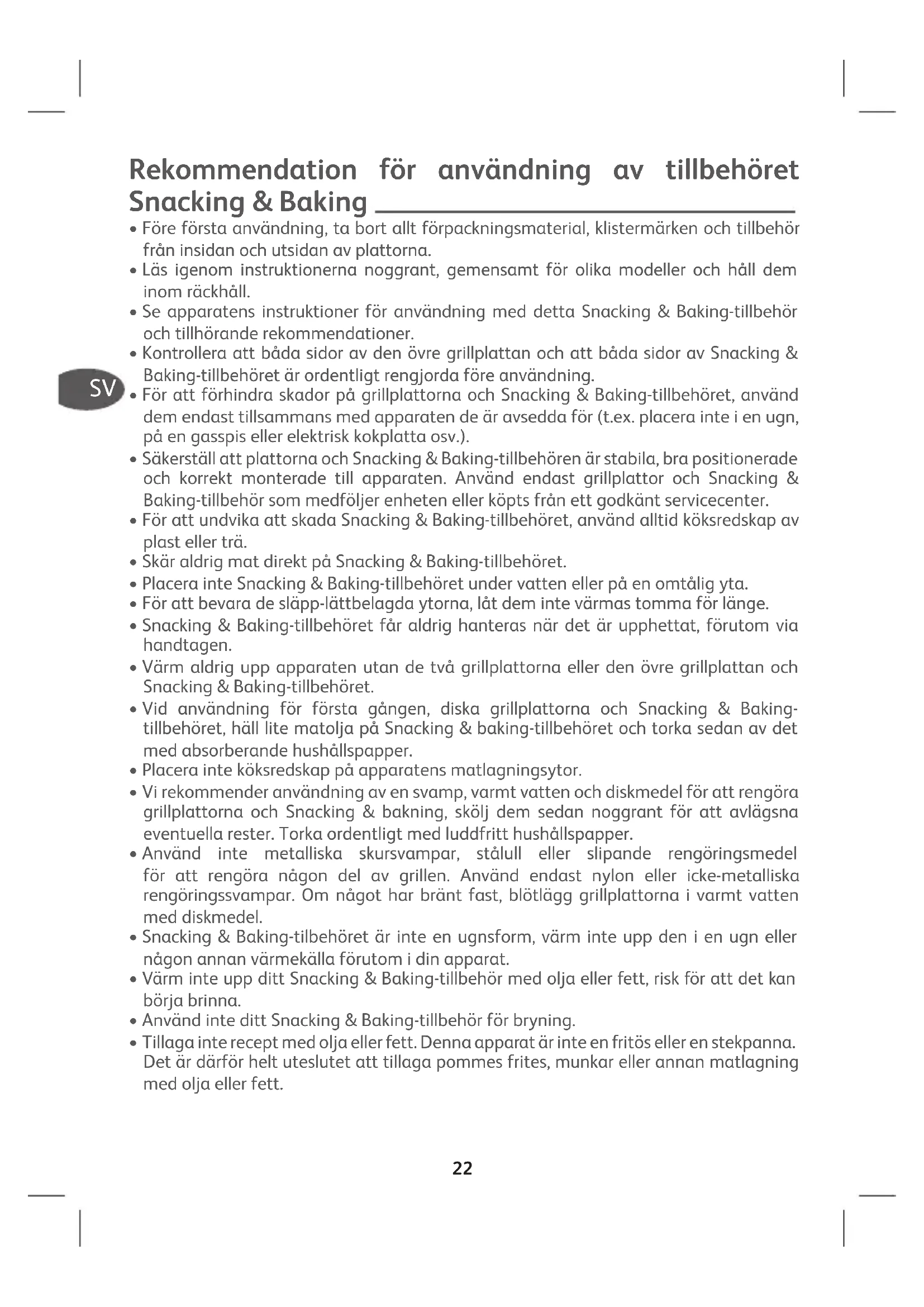- Värm inte upp ditt Snacking & Baking-tillbehör med olja eller fett, risk för att det kan börja brinna.