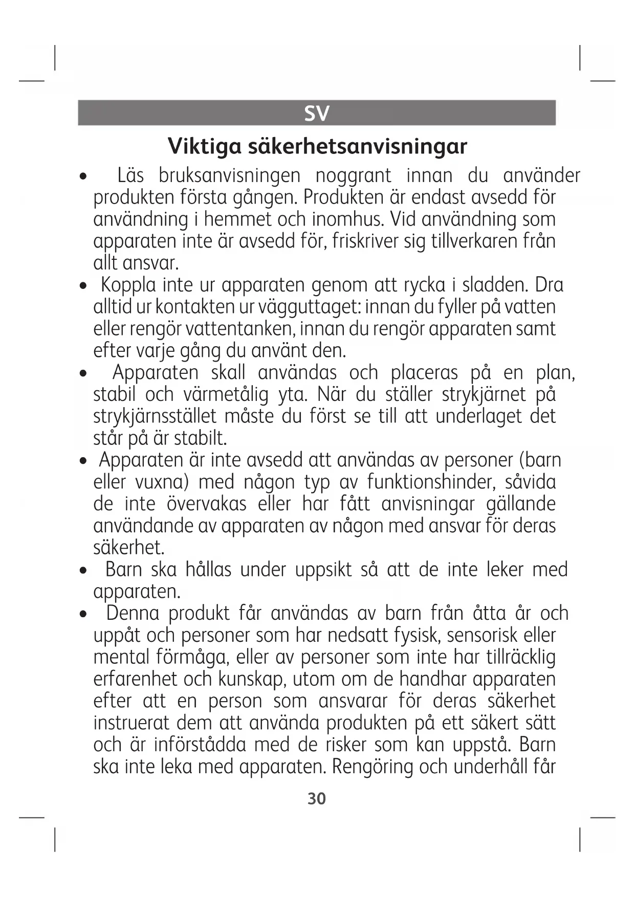 - Denna produkt får användas av barn från åtta år och uppåt och personer som har nedsatt fysisk, sensorisk eller mental förmåga, eller av personer som inte har tillräcklig erfarenhet och kunskap, utom om de handhar apparaten efter att en person som ansvarar för deras säkerhet instruerat dem att använda produkten på ett säkert sätt och är införstådda med de risker som kan uppstå. Barn ska inte leka med apparaten. Rengöring och underhåll får 30inte göras av barn utan tillsyn. Håll strykjärnet och dess sladd utom räckhåll för barn som är yngre än 8 år när det används eller håller på att svalna.