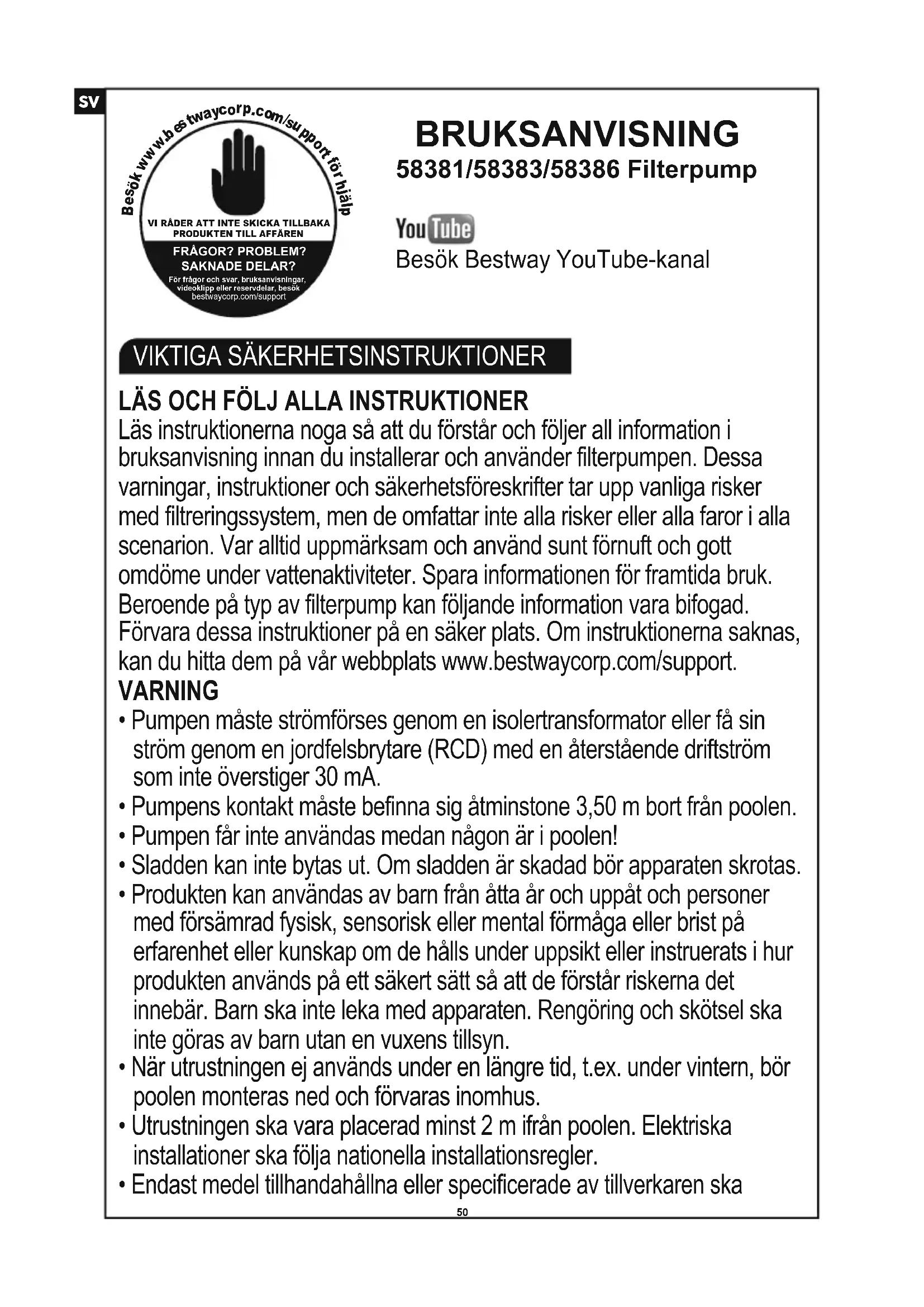Besök Bestway YouTube-kanal BRUKSANVISNING58381/58383/58386 FilterpumpLÄS OCH FÖLJ ALLA INSTRUKTIONERLäs instruktionerna noga så att du förstår och följer all information i bruksanvisning innan du installerar och använder filterpumpen. Dessa varningar, instruktioner och säkerhetsföreskrifter tar upp vanliga risker med filtreringssystem, men de omfattar inte alla risker eller alla faror i alla scenarion. Var alltid uppmärksam och använd sunt förnuft och gott omdöme under vattenaktiviteter. Spara informationen för framtida bruk. Beroende på typ av filterpump kan följande information vara bifogad. Förvara dessa instruktioner på en säker plats. Om instruktionerna saknas, kan du hitta dem på vår webbplats www.bestwaycorp.com/support.VARNING• Pumpen måste strömförses genom en isolertransformator eller få sinström genom en jordfelsbrytare (RCD) med en återstående driftström som inte överstiger 30 mA.• Pumpens kontakt måste befinna sig åtminstone 3,50 m bort från poolen.• Pumpen får inte användas medan någon är i poolen!• Sladden kan inte bytas ut. Om sladden är skadad bör apparaten skrotas.• Produkten kan användas av barn från åtta år och uppåt och personermed försämrad fysisk, sensorisk eller mental förmåga eller brist på erfarenhet eller kunskap om de hålls under uppsikt eller instruerats i hur produkten används på ett säkert sätt så att de förstår riskerna det innebär. Barn ska inte leka med apparaten. Rengöring och skötsel ska inte göras av barn utan en vuxens tillsyn.• När utrustningen ej används under en längre tid, t.ex. under vintern, börpoolen monteras ned och förvaras inomhus.• Utrustningen ska vara placerad minst 2 m ifrån poolen. Elektriskainstallationer ska följa nationella installationsregler.• Endast medel tillhandahållna eller specificerade av tillverkaren ska användas tillsammans med installation av produkten.• Det är nödvändigt att kontrollera att sugöppningarna inte är blockerade.• Vi råder dig att stoppa filtreringen under underhållsarbeten påfiltreringssystemet.• Övervaka regelbundet filtrets igentäppningsnivå.• Veckokontroll rekommenderas för rengöring.• Minimum 8 timmars daglig filtrering rekommenderas för att säkerställarent poolvatten.• Det är nödvändigt att byta skadad utrustning eller uppsättning av utruning så snabbt som möjligt. Använd endast delar godkända av personer som ansvarar för produktens placering på marknaden.• Alla filter och filtermaterial ska kontrolleras regelbundet för att säkerställa att det inte finns några smutsrester som förhindrar god filtrering. Kassering av alla använda filtermaterial ska överensstämma med gällande bestämmelser/lagstiftningar.• Vattencirkulationsanläggningen ska överensstämma med såväl eurpeisk som nationell/lokal lagstiftning, särskilt när det gäller elektriska anslutningar. Varje ändring av ventilposition, pumpstorlek, gallerstorlek kan orsaka flödesbyte och sughastigheten kan ökas.