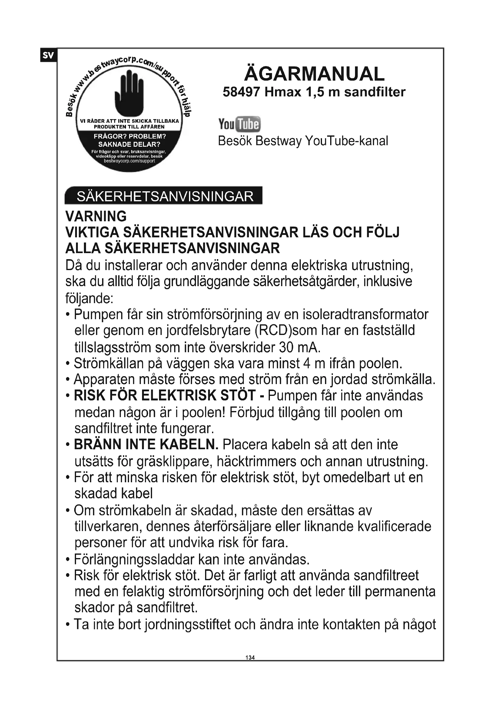 SÄKERHETSANVISNINGAR Besök Bestway YouTube-kanal ÄGARMANUAL 58497 Hmax 1,5 m sandfilter VI RÅDER ATT INTE SKICKA TILLBAKAPRODUKTEN TILL AFFÄRENFRÅGOR? PROBLEM?SAKNADE DELAR?För frågor och svar, bruksanvisningar,videoklipp eller reservdelar, besökbestwaycorp.com/support
