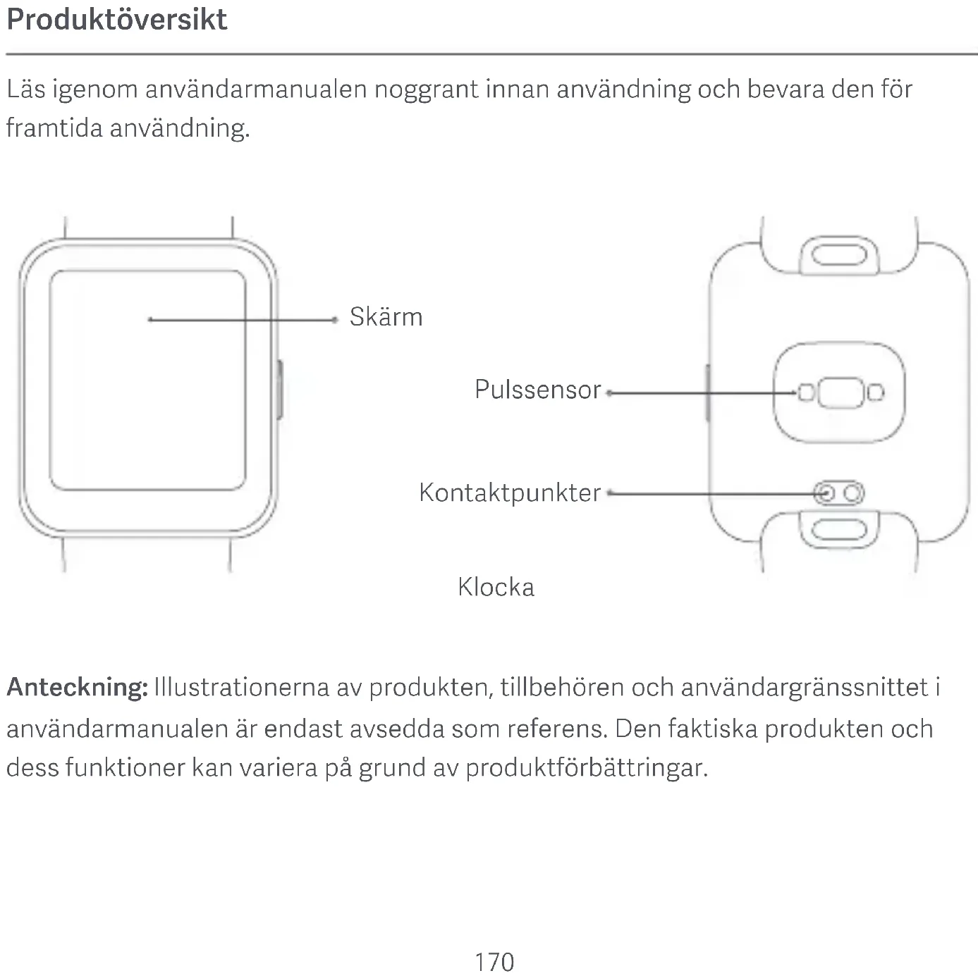 - Den här klockan är inte en medicinsk enhet. Data och information som enheten tillhandahåller bör inte användas för diagnos, behandling eller förebyggande av sjukdomar.