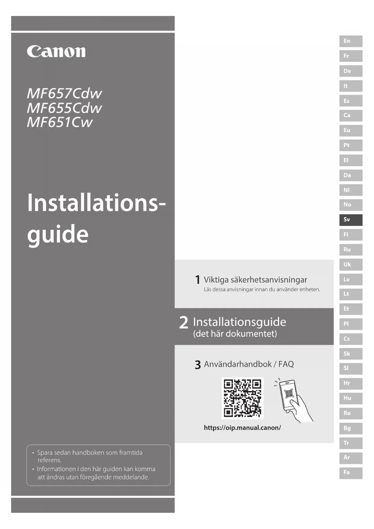 - Spara sedan handboken som framtida referens.• Informationen i den här guiden kan komma att ändras utan föregående meddelande.https://oip.manual.canon/ Viktiga säkerhetsanvisningarLäs dessa anvisningar innan du använder enheten. Användarhandbok / FAQ