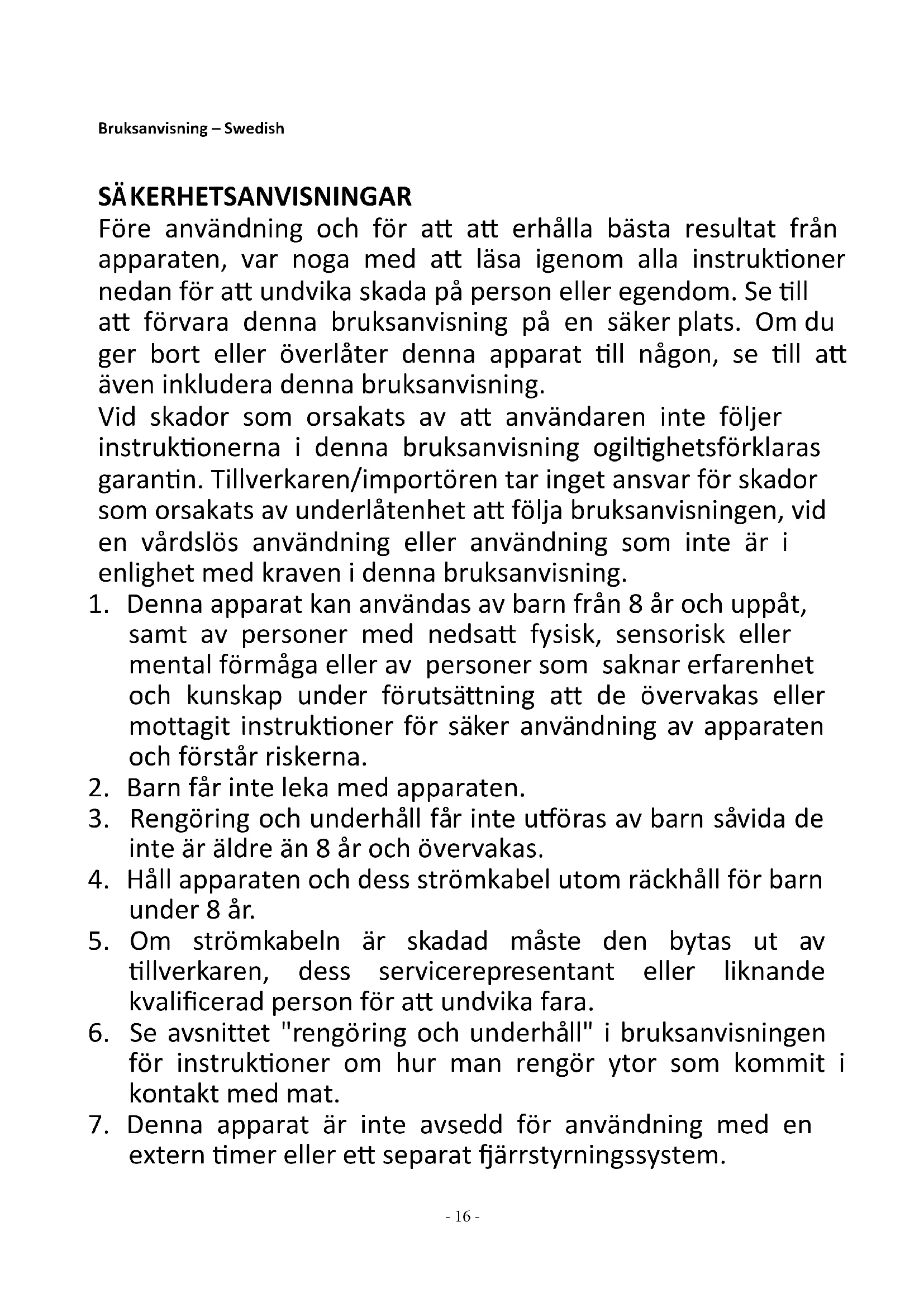 Recyclage – Directive européenne 2012/19/EU Ce symbole indique que le produit ne doit pas être jeté avec les ordures ménagères. Pour limiter les risques pour l’environnement et la santé entraînés par le rejet non contrôlé des déchets, recyclez ce dernier pour promouvoir une réutilisation responsable de ses matériaux. Pour recycler votre produit, utilisez les réseaux de collecte de votre région ou prenez contact avec le revendeur du produit. Ce dernier pourra vous aider à le recycler. Emerio Deutschland GmbH (no service address) Lerchenweg 3 40789 Monheim am Rhein Deutschland Service a la clientele: T: +49 (0) 3222 1097 600 E: info.de@emerio.eu- 16 - Bruksanvisning – Swedish SÄKERHETSANVISNINGAR Före användning och för att att erhålla bästa resultat från apparaten, var noga med att läsa igenom alla instruktioner nedan för att undvika skada på person eller egendom. Se till att förvara denna bruksanvisning på en säker plats. Om du ger bort eller överlåter denna apparat till någon, se till att även inkludera denna bruksanvisning. Vid skador som orsakats av att användaren inte följer instruktionerna i denna bruksanvisning ogiltighetsförklaras garantin. Tillverkaren/importören tar inget ansvar för skador som orsakats av underlåtenhet att följa bruksanvisningen, vid en vårdslös användning eller användning som inte är i enlighet med kraven i denna bruksanvisning.