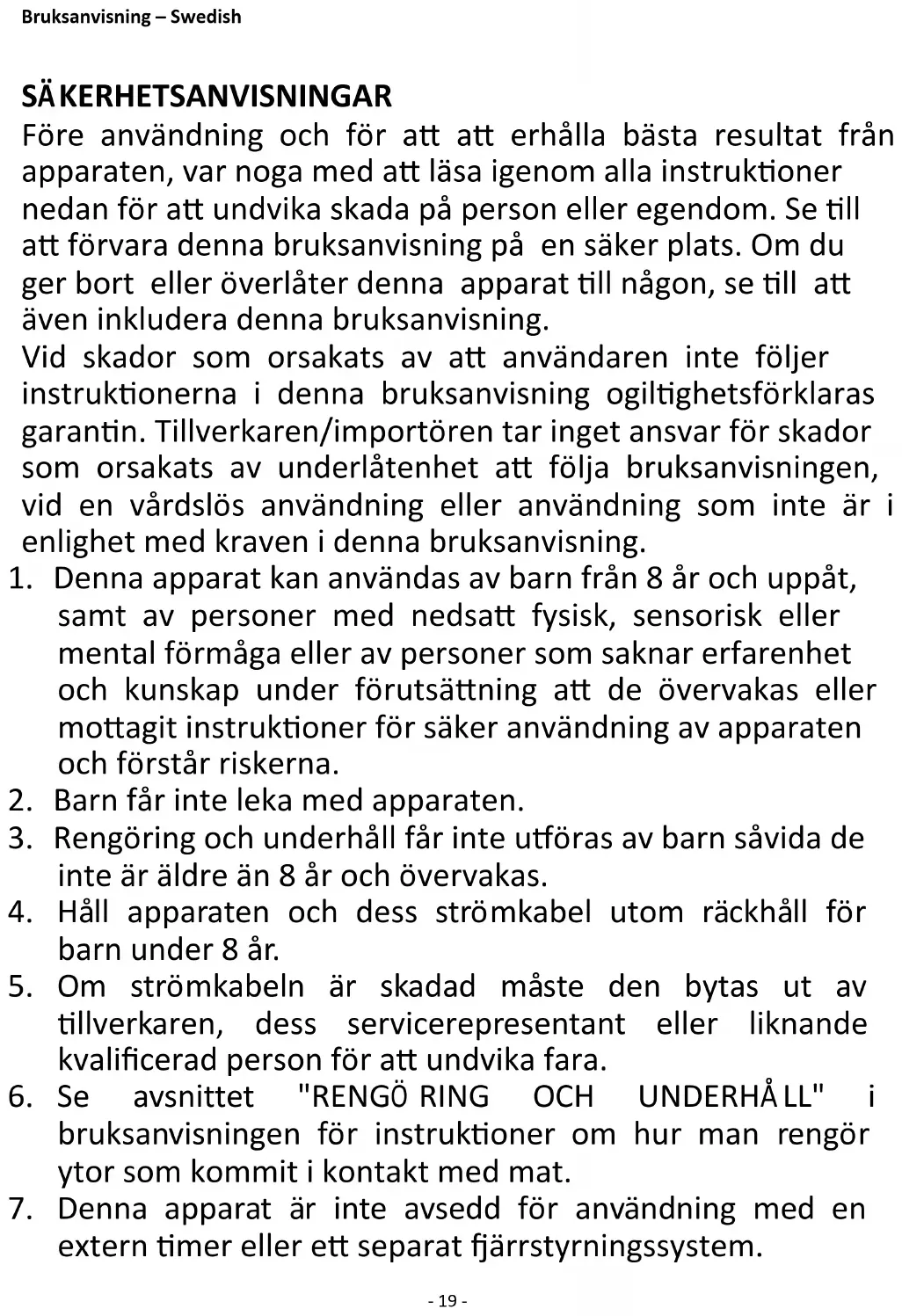 Recyclage – Directive européenne 2012/19/EU Ce symbole indique que le produit ne doit pas être jeté avec les ordures ménagères. Pour limiter les risques pour l’environnement et la santé entraînés par le rejet non contrôlé des déchets, recyclez ce dernier pour promouvoir une réutilisation responsable de ses matériaux. Pour recycler votre produit, utilisez les réseaux de collecte de votre région ou prenez contact avec le revendeur du produit. Ce dernier pourra vous aider à le recycler. Emerio Deutschland GmbH (no service address) Lerchenweg 3 40789 Monheim am Rhein Deutschland Service à la clientèle: T: +49 (0) 3222 1097 600 E: info.de@emerio.eu- 19 - Bruksanvisning – Swedish SÄKERHETSANVISNINGAR Före användning och för att att erhålla bästa resultat från apparaten, var noga med att läsa igenom alla instruktioner nedan för att undvika skada på person eller egendom. Se till att förvara denna bruksanvisning på en säker plats. Om du ger bort eller överlåter denna apparat till någon, se till att även inkludera denna bruksanvisning. Vid skador som orsakats av att användaren inte följer instruktionerna i denna bruksanvisning ogiltighetsförklaras garantin. Tillverkaren/importören tar inget ansvar för skador som orsakats av underlåtenhet att följa bruksanvisningen, vid en vårdslös användning eller användning som inte är i enlighet med kraven i denna bruksanvisning.