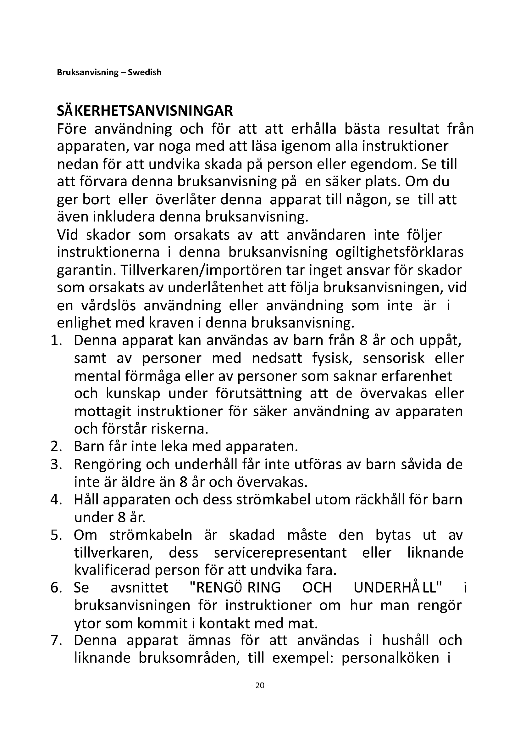 Recyclage – Directive européenne 2012/19/EU Ce symbole indique que le produit ne doit pas être jeté avec les ordures ménagères. Pour limiter les risques pour l’environnement et la santé entraînés par le rejet non contrôlé des déchets, recyclez ce dernier pour promouvoir une réutilisation responsable de ses matériaux. Pour recycler votre produit, utilisez les réseaux de collecte de votre région ou prenez contact avec le revendeur du produit. Ce dernier pourra vous aider à le recycler. Emerio B.V. Customer service: Kundeninformation: Klantenservice: Oudeweg 115 T: +31 (0) 23 3034369 T: +49 (0) 3222 1097 600 T: +31 (0) 23 3034369 2031 CC Haarlem www.emerio.eu/service www.emerio.eu/service www.emerio.eu/service The Netherlands Looking for spare parts? Have a look at https://spareparts.emerio.eu Sie brauchen Ersatzteile? Besuchen Sie https://ersatzteile.emerio.eu Onderdelen nodig? Kijk op https://onderdelen.emerio.eu- 20 - Bruksanvisning – Swedish SÄKERHETSANVISNINGAR Före användning och för att att erhålla bästa resultat från apparaten, var noga med att läsa igenom alla instruktioner nedan för att undvika skada på person eller egendom. Se till att förvara denna bruksanvisning på en säker plats. Om du ger bort eller överlåter denna apparat till någon, se till att även inkludera denna bruksanvisning. Vid skador som orsakats av att användaren inte följer instruktionerna i denna bruksanvisning ogiltighetsförklaras garantin. Tillverkaren/importören tar inget ansvar för skador som orsakats av underlåtenhet att följa bruksanvisningen, vid en vårdslös användning eller användning som inte är i enlighet med kraven i denna bruksanvisning.
