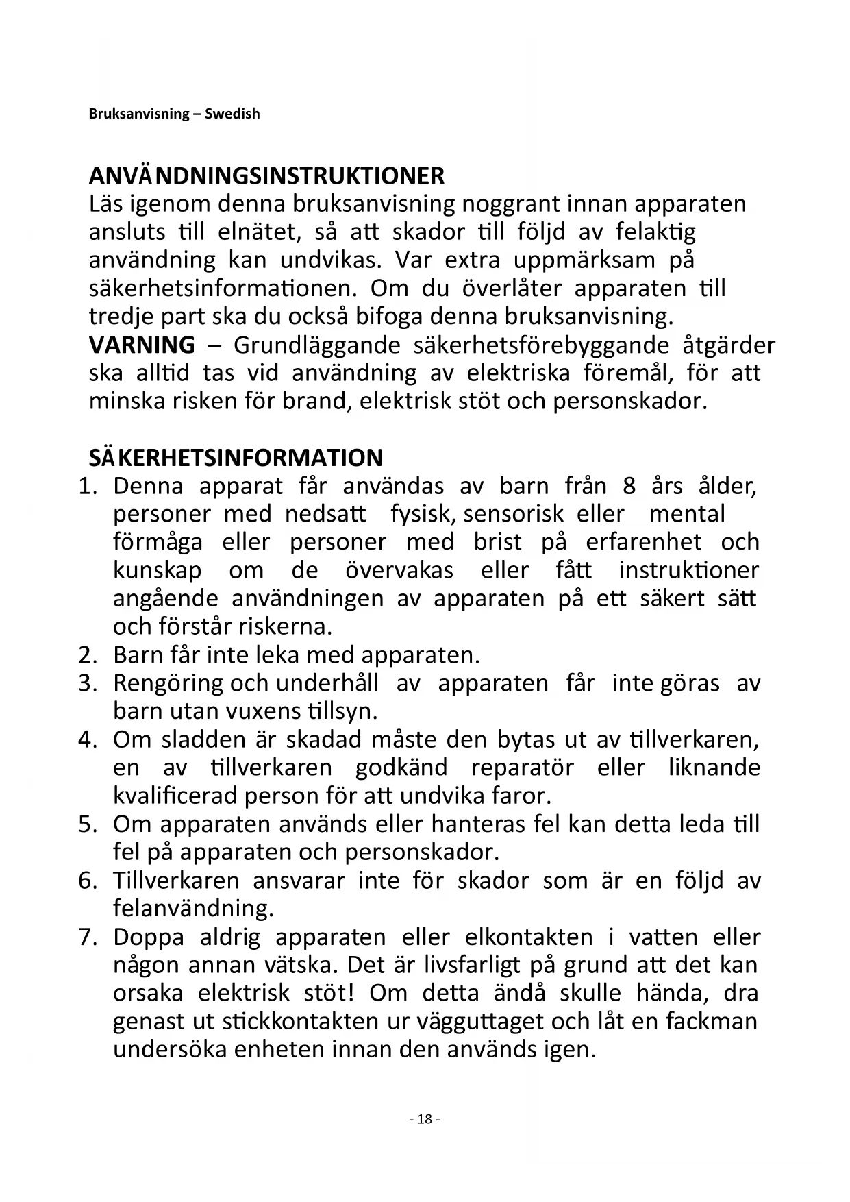 TEKNISKA DATA Elstandard: 220-240V ~ 50Hz Strömförbrukning: 30W