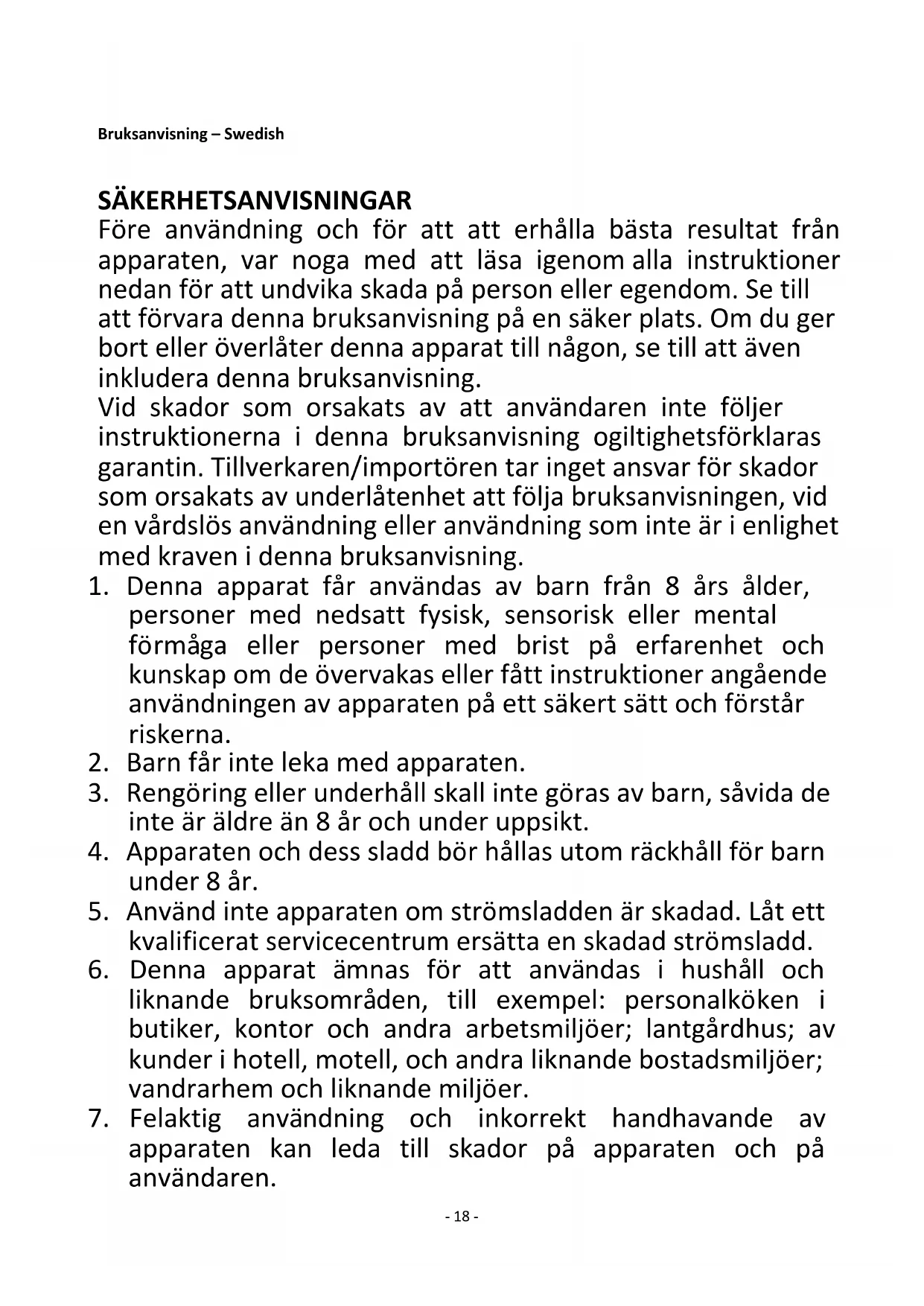 The Netherlands- 18 - Bruksanvisning – Swedish SÄKERHETSANVISNINGAR Före användning och för att att erhålla bästa resultat från apparaten, var noga med att läsa igenom alla instruktioner nedan för att undvika skada på person eller egendom. Se till att förvara denna bruksanvisning på en säker plats. Om du ger bort eller överlåter denna apparat till någon, se till att även inkludera denna bruksanvisning. Vid skador som orsakats av att användaren inte följer instruktionerna i denna bruksanvisning ogiltighetsförklaras garantin. Tillverkaren/importören tar inget ansvar för skador som orsakats av underlåtenhet att följa bruksanvisningen, vid en vårdslös användning eller användning som inte är i enlighet med kraven i denna bruksanvisning.