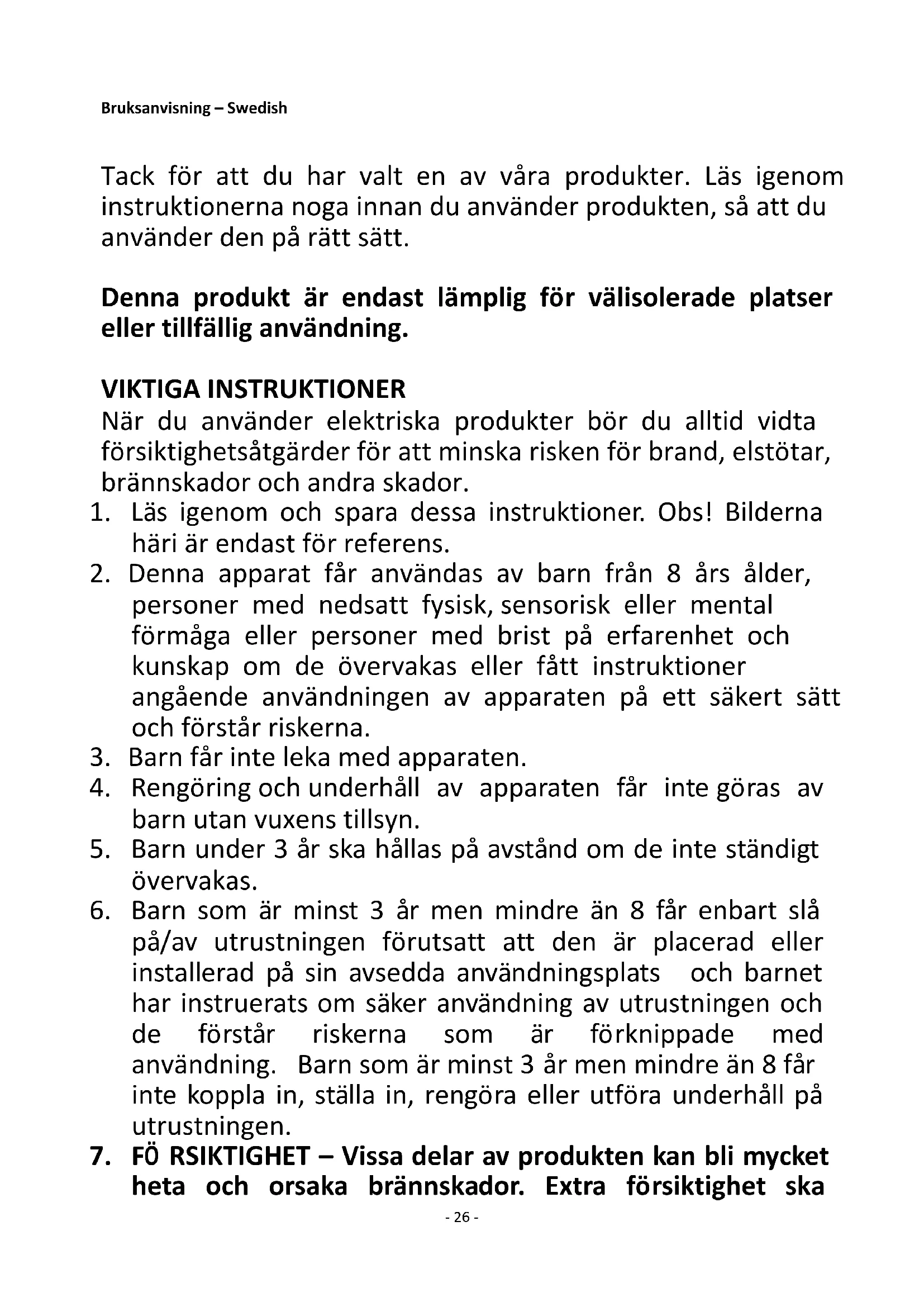 21. Låt inte barn leka med eller ansluta värmefläkten. Se till