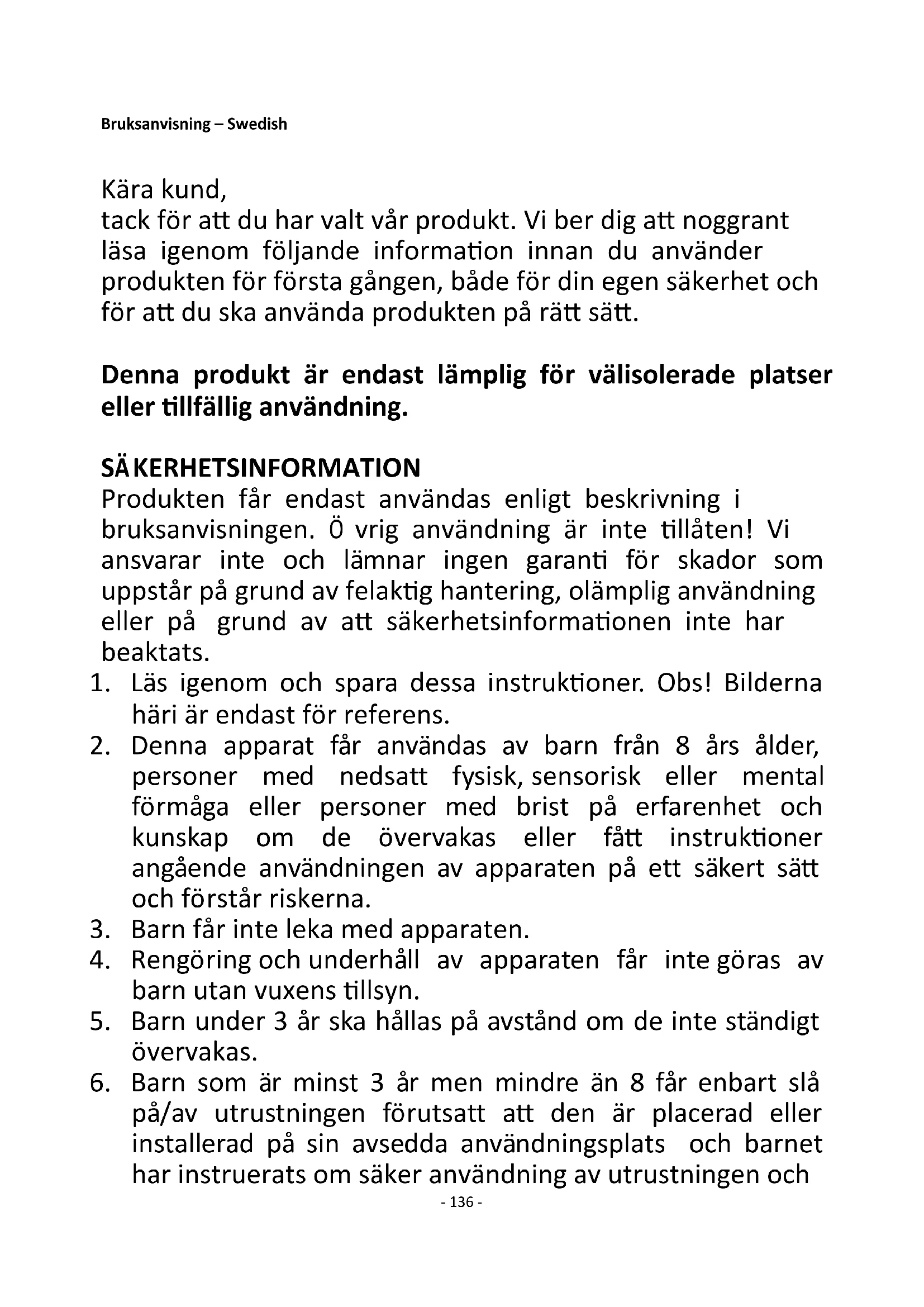 Ustreza zahtevam direktiv Sveta: UREDBA KOMISIJE (EU) št. 2015/1188 z dne 28. aprila 2015 in UREDBA KOMISIJE (EU) št. 2016/2282 o izvajanju Direktive 2009/125/ES Evropskega parlamenta in Sveta o vzpostavitvi okvira za določanje zahtev za okoljsko primerno zasnovo izdelkov, povezanih z energijo Informacije za potrošnike o načinu namestitve, uporabe in vzdrževanja izdelka, informacije OEEO lahko preverite v priročniku z navodili, ki je priložen embalaži.- 136 - Bruksanvisning – Swedish Kära kund, tack för att du har valt vår produkt. Vi ber dig att noggrant läsa igenom följande information innan du använder produkten för första gången, både för din egen säkerhet och för att du ska använda produkten på rätt sätt. Denna produkt är endast lämplig för välisolerade platser eller tillfällig användning. SÄKERHETSINFORMATION Produkten får endast användas enligt beskrivning i bruksanvisningen. Ö vrig användning är inte tillåten! Vi ansvarar inte och lämnar ingen garanti för skador som uppstår på grund av felaktig hantering, olämplig användning eller på grund av att säkerhetsinformationen inte har beaktats.