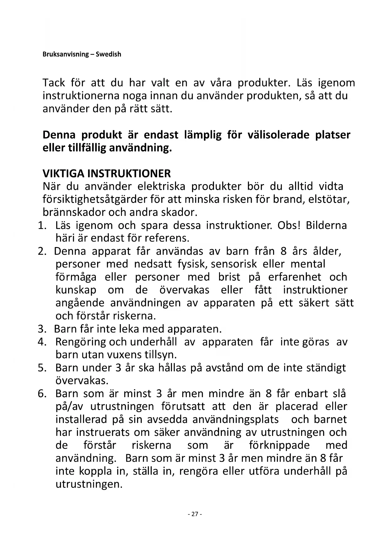 25. Låt inte barn leka med eller ansluta värmefläkten. Se till
