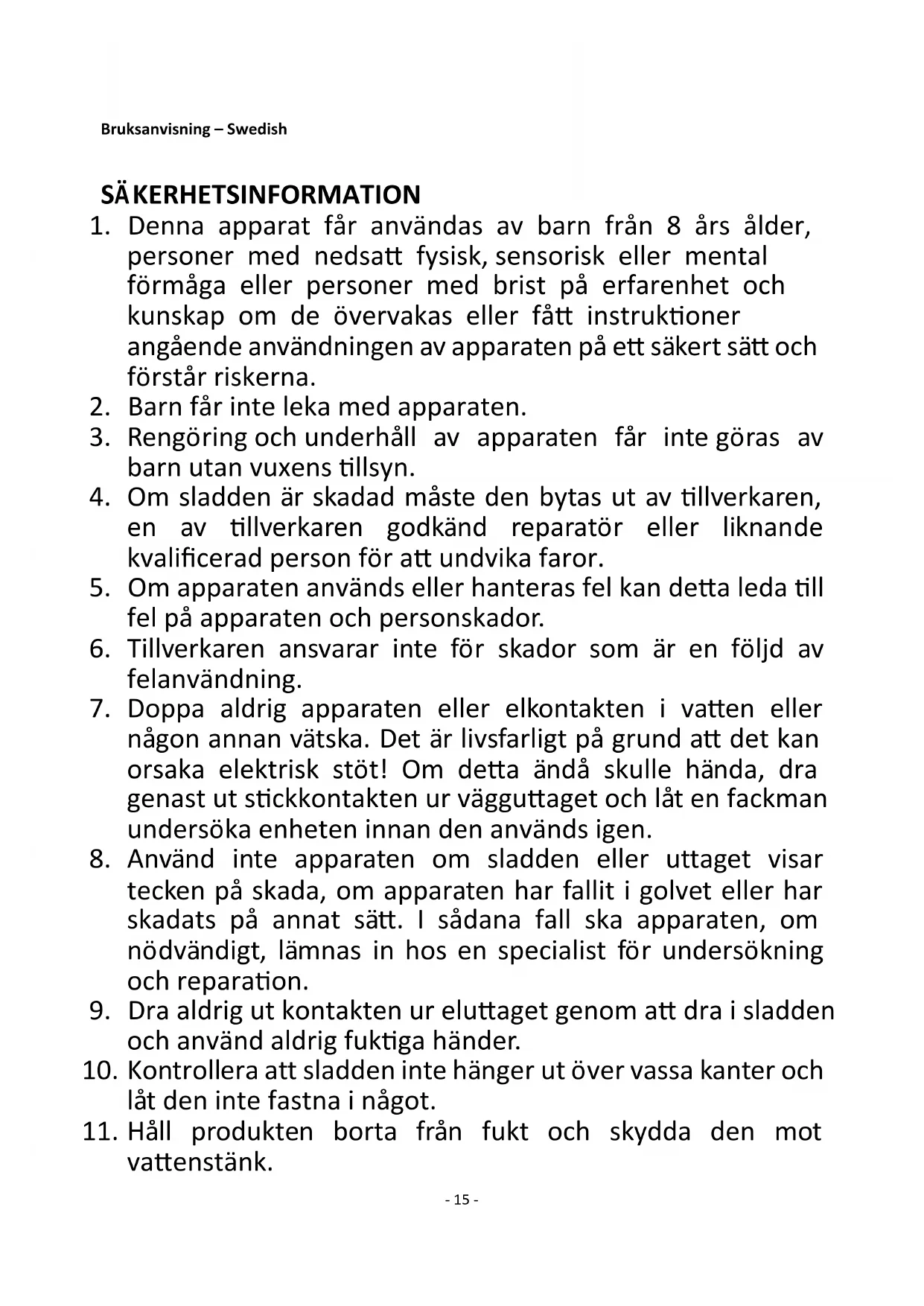 4. Om sladden är skadad måste den bytas ut av tillverkaren,