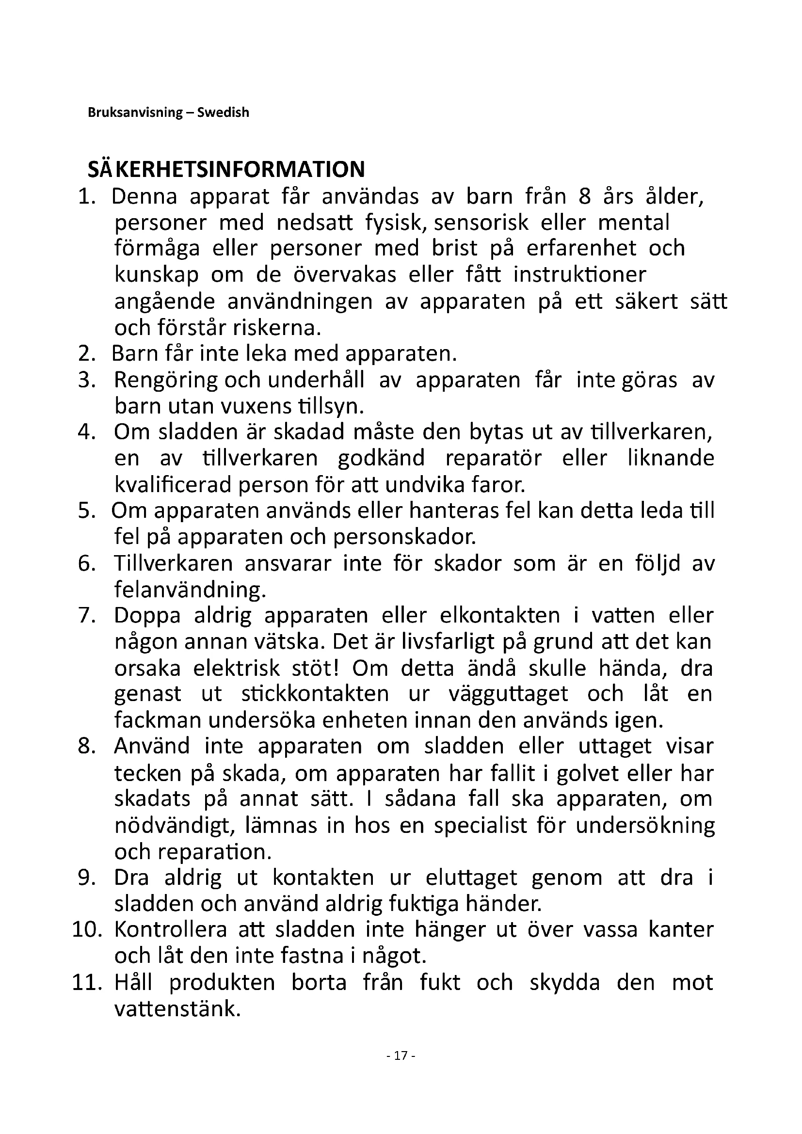 17. Förvara produkten på en torr plats utom räckhåll för barn