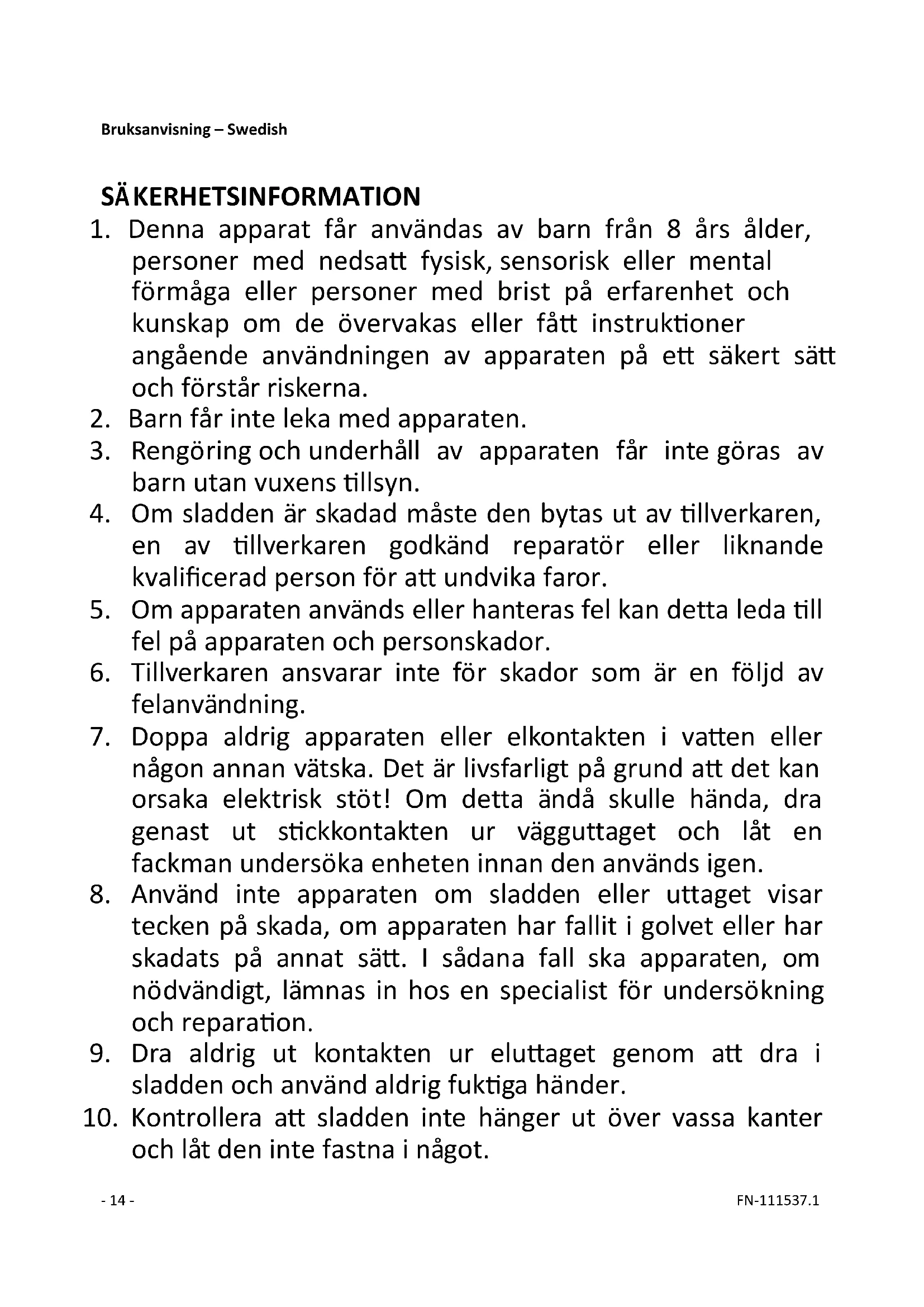 13. Apparaten och dess sladd bör hållas utom räckhåll för