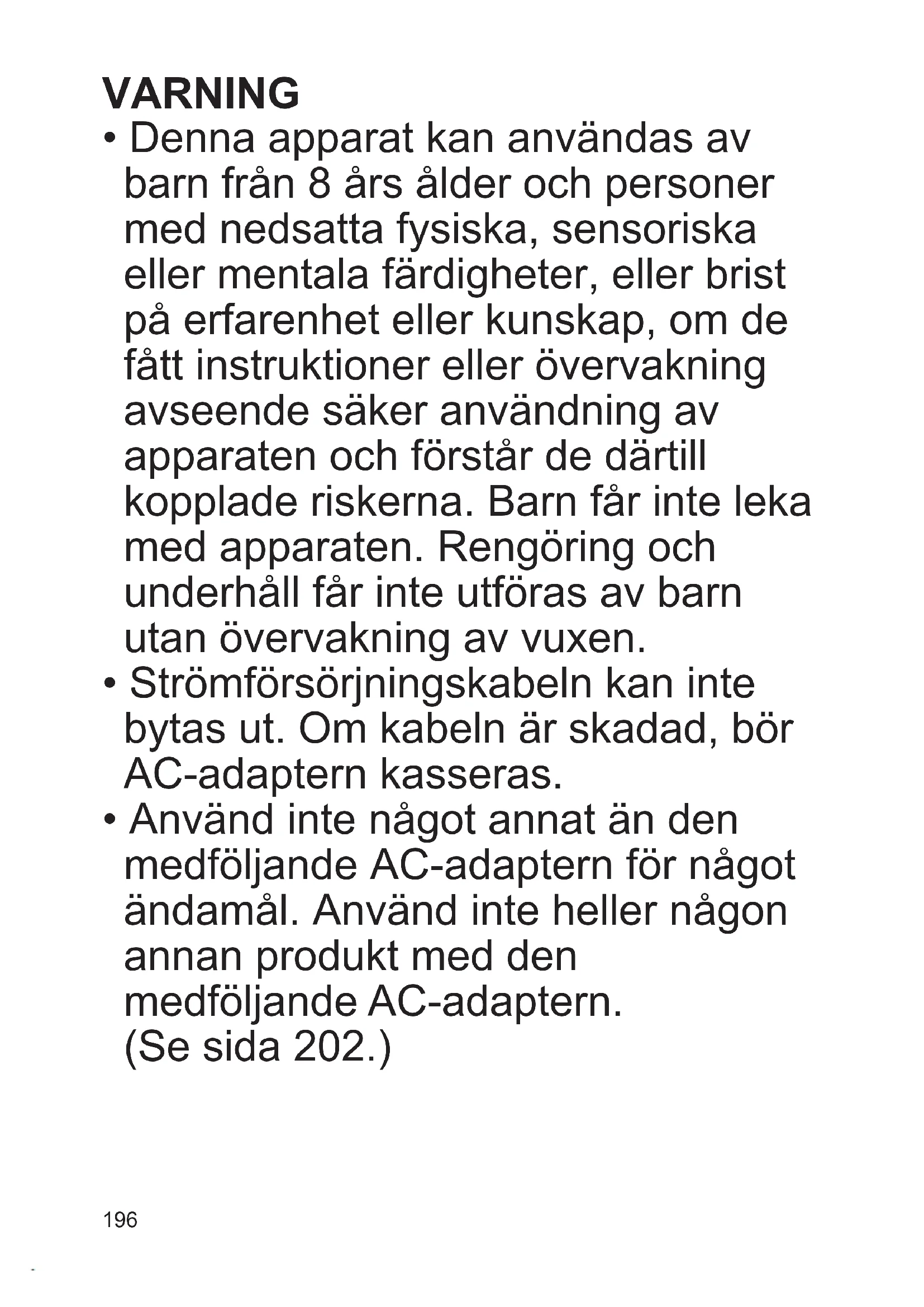 - Denna apparat kan användas av barn från 8 års ålder och personer med nedsatta fysiska, sensoriska eller mentala färdigheter, eller brist på erfarenhet eller kunskap, om de fått instruktioner eller övervakning avseende säker användning av apparaten och förstår de därtill kopplade riskerna. Barn får inte leka medapparaten.Rengöringoch underhåll får inte utföras av barn utan övervakning av vuxen.