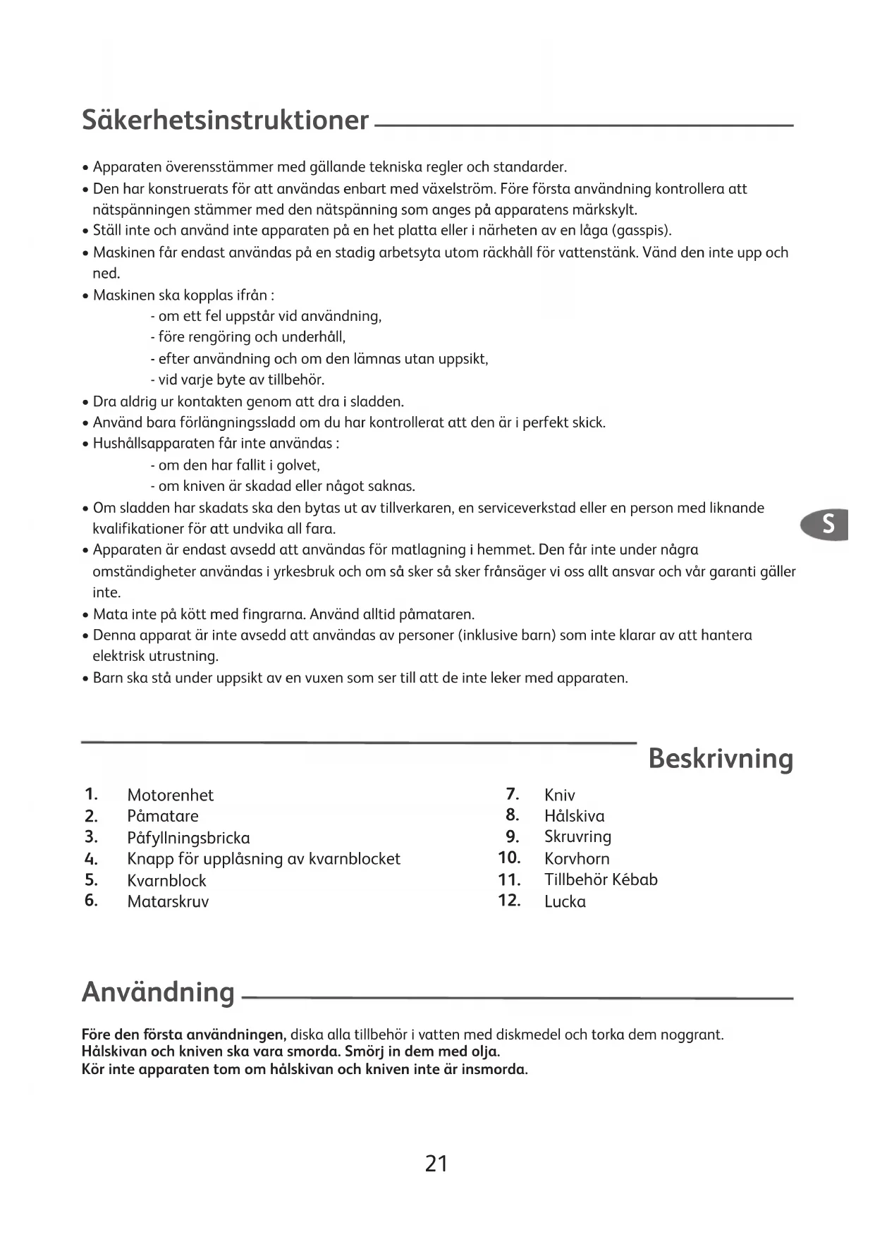 - Hushållsapparaten får inte användas : - om den har fallit i golvet, - om kniven är skadad eller något saknas.