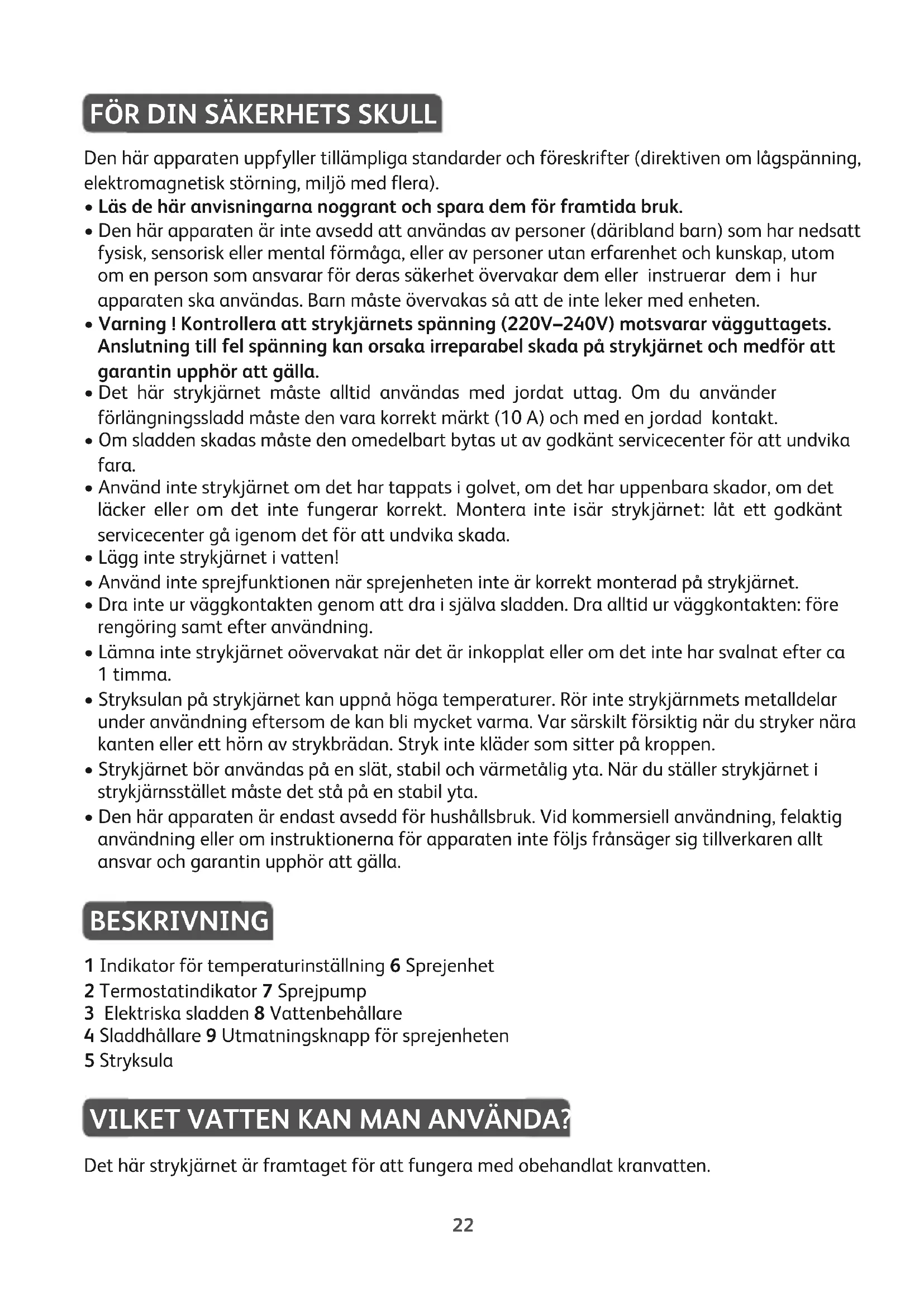 - Den här apparaten är endast avsedd för hushållsbruk. Vid kommersiell användning, felaktig användning eller om instruktionerna för apparaten inte följs frånsäger sig tillverkaren allt ansvar och garantin upphör att gälla. BESKRIVNING 1 Indikator för temperaturinställning 6 Sprejenhet 2 Termostatindikator 7 Sprejpump 3 Elektriska sladden 8 Vattenbehållare 4 Sladdhållare 9 Utmatningsknapp för sprejenheten 5 Stryksula VILKET VATTEN KAN MAN ANVÄNDA? Det här strykjärnet är framtaget för att fungera med obehandlat kranvatten. 9100013389 FS45XX_110x154 23/05/13 12:33 Page2223