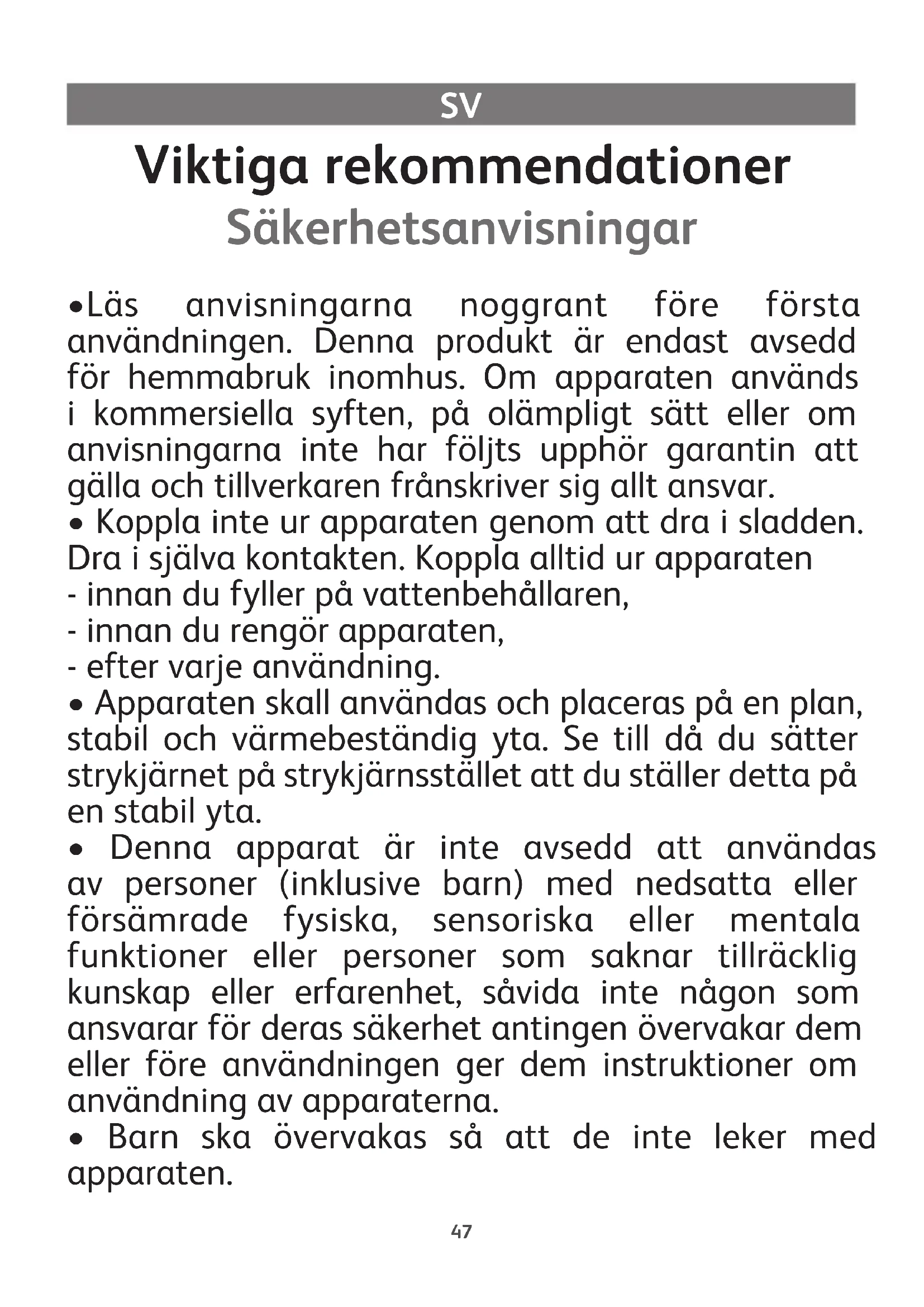 - Denna apparat kan användas av barn från 8 år och uppåt och av personer utan tillräcklig kunskap eller erfarenhet eller av personer med nedsatta fysiska, sensoriska eller mentala funktioner, förutsatt att de har fått noggranna instruktioner avseende användningen av apparaten, övervakas och förstår de härmed sammanhängande riskerna. Barn ska inte leka med apparaten. Rengöring och underhåll får inte utföras av barn utan tillsyn. Håll strykjärnet och dess sladd utom räckhåll för barn som är yngre än 8 år när det används eller håller på att svalna.