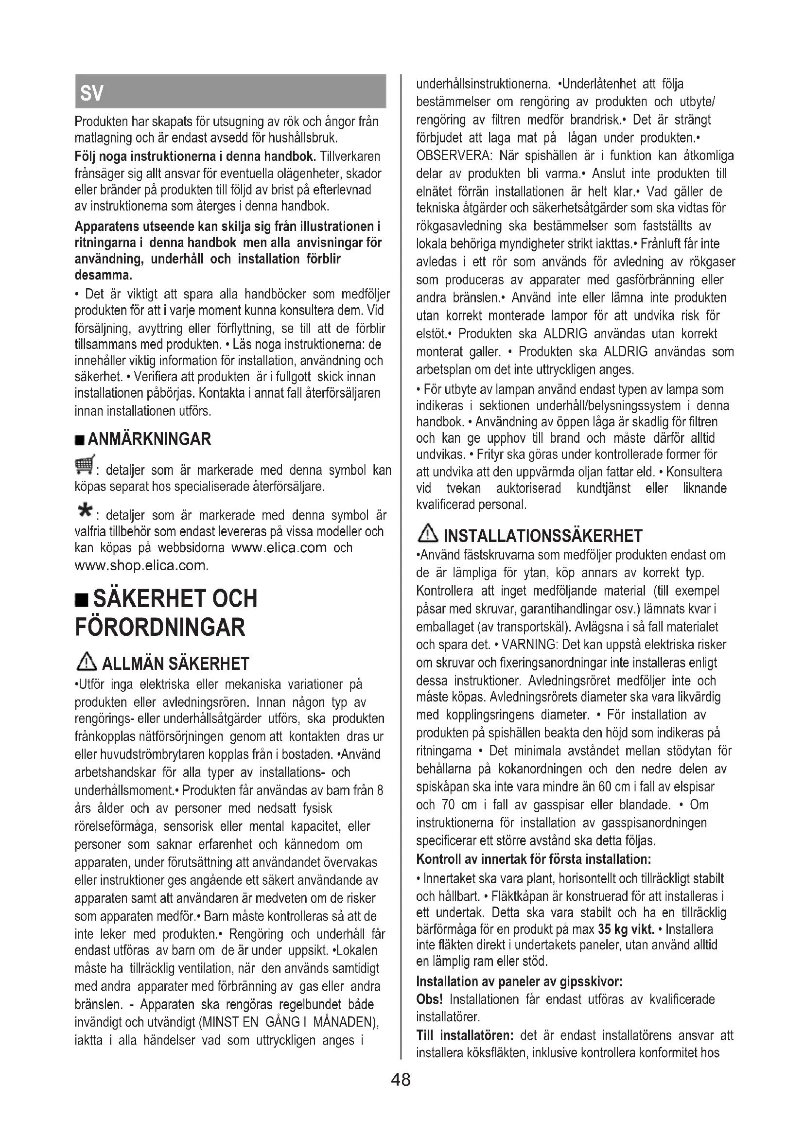 - Det är viktigt att spara alla handböcker som medföljer produkten för att i varje moment kunna konsultera dem. Vid försäljning, avyttring eller förflyttning, se till att de förblir tillsammans med produkten. • Läs noga instruktionerna: de innehåller viktig information för installation, användning och säkerhet. • Verifiera att produkten är i fullgott skick innan installationen påbörjas. Kontakta i annat fall återförsäljaren innan installationen utförs. ANMÄRKNINGAR : detaljer som är markerade med denna symbol kan köpas separat hos specialiserade återförsäljare. : detaljer som är markerade med denna symbol är valfria tillbehör som endast levereras på vissa modeller och kan köpas på webbsidorna www.elica.com och www.shop.elica.com.