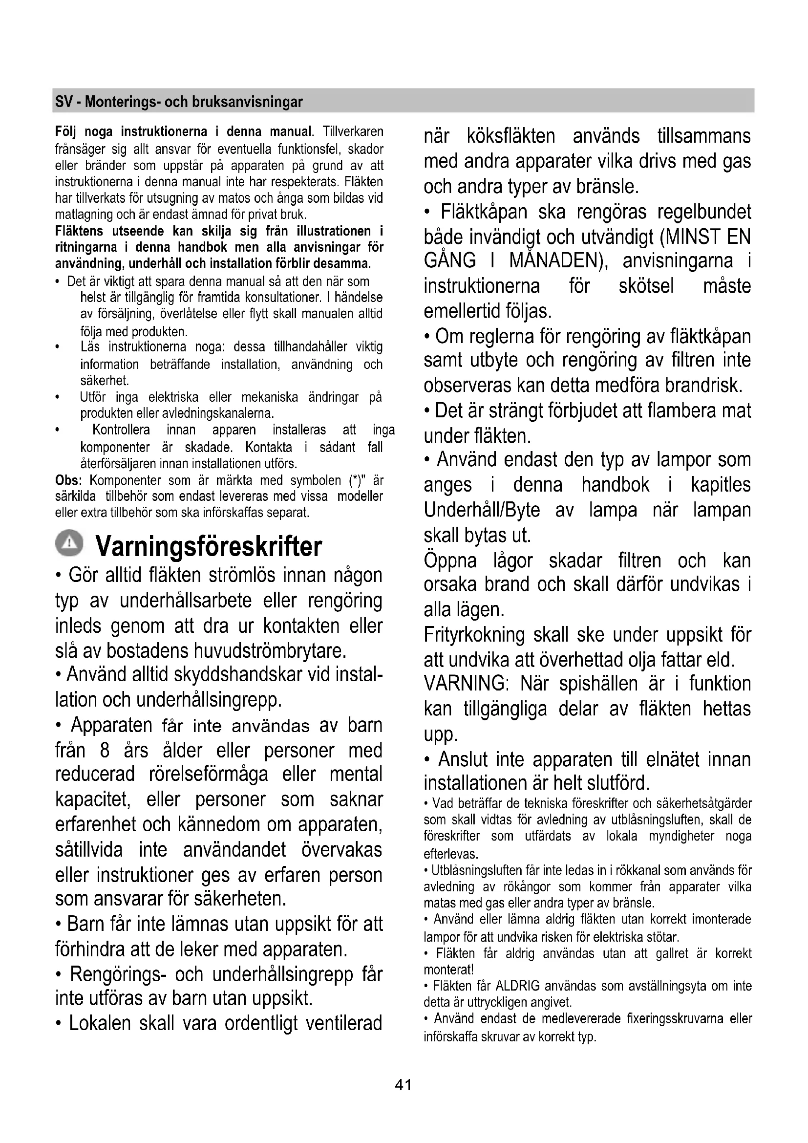 Για την αντικατάσταση τους, απευθυνθείτε στην υπηρεσία τεχνικής βοήθειας41 SV - Monterings- och bruksanvisningar Följ noga instruktionerna i denna manual. Tillverkaren frånsäger sig allt ansvar för eventuella funktionsfel, skador eller bränder som uppstår på apparaten på grund av att instruktionerna i denna manual inte har respekterats. Fläkten har tillverkats för utsugning av matos och ånga som bildas vid matlagning och är endast ämnad för privat bruk. Fläktens utseende kan skilja sig från illustrationen i ritningarna i denna handbok men alla anvisningar för användning, underhåll och installation förblir desamma.