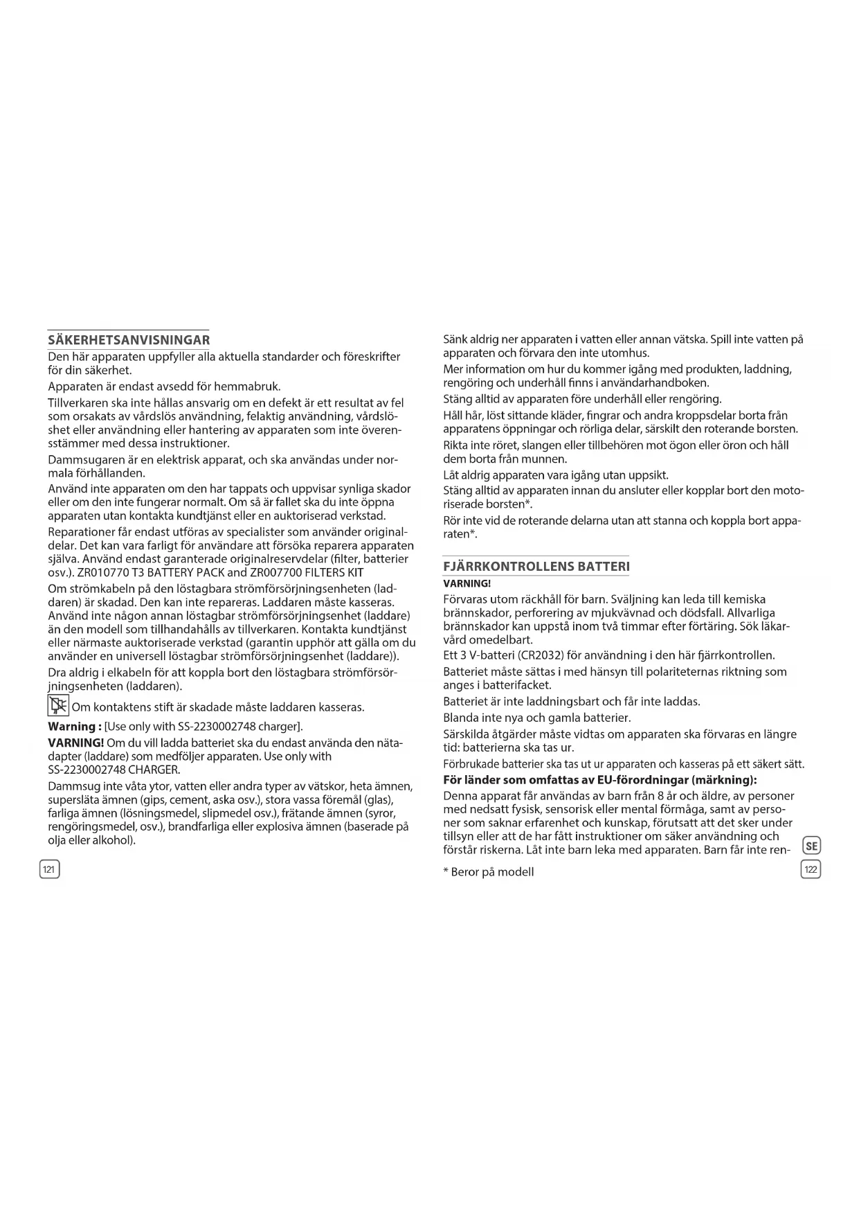 SÄKERHETSANVISNINGAR Den här apparaten uppfyller alla aktuella standarder och föreskrifter för din säkerhet. Apparaten är endast avsedd för hemmabruk. Tillverkaren ska inte hållas ansvarig om en defekt är ett resultat av fel som orsakats av vårdslös användning, felaktig användning, vårdslö- shet eller användning eller hantering av apparaten som inte överen- sstämmer med dessa instruktioner. Dammsugaren är en elektrisk apparat, och ska användas under nor- mala förhållanden. Använd inte apparaten om den har tappats och uppvisar synliga skador eller om den inte fungerar normalt. Om så är fallet ska du inte öppna apparaten utan kontakta kundtjänst eller en auktoriserad verkstad. Reparationer får endast utföras av specialister som använder original- delar. Det kan vara farligt för användare att försöka reparera apparaten själva. Använd endast garanterade originalreservdelar (lter, batterier osv.). ZR010770 T3 BATTERY PACK and ZR007700 FILTERS KIT Om strömkabeln på den löstagbara strömförsörjningsenheten (lad- daren) är skadad. Den kan inte repareras. Laddaren måste kasseras. Använd inte någon annan löstagbar strömförsörjningsenhet (laddare) än den modell som tillhandahålls av tillverkaren. Kontakta kundtjänst eller närmaste auktoriserade verkstad (garantin upphör att gälla om du använder en universell löstagbar strömförsörjningsenhet (laddare)). Dra aldrig i elkabeln för att koppla bort den löstagbara strömförsör- jningsenheten (laddaren). Om kontaktens stift är skadade måste laddaren kasseras.