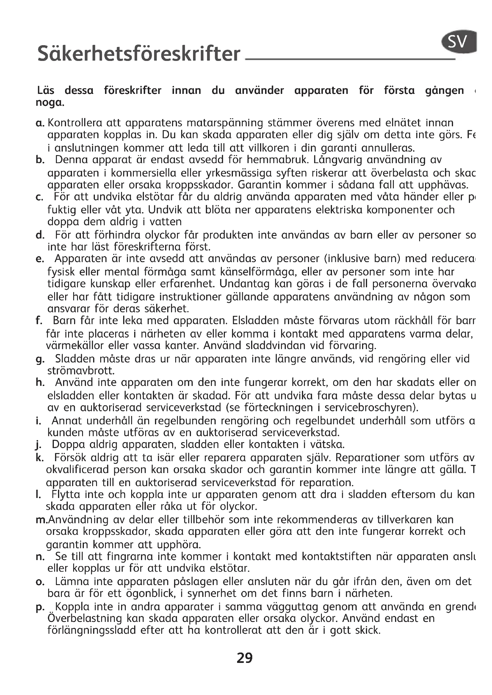 ligeiramente humedecido. Arrumação Utilize o compartimento de arrumação do cabo para ganhar espaço (fig. 2). Produtos eléctricos e eléctrónicos em fin de vida Protecção do ambiente em primeiro lugar! O seu aparelho contém materiais que podem ser recuperados ou reciclados. Entregue-o num ponto de recolha para possibilitar o seu tratamento.29 Säkerhetsföreskrifter Läs dessa föreskrifter innan du använder apparaten för första gången och följ dem noga. a. Kontrollera att apparatens matarspänning stämmer överens med elnätet innan apparaten kopplas in. Du kan skada apparaten eller dig själv om detta inte görs. Fel i anslutningen kommer att leda till att villkoren i din garanti annulleras. b. Denna apparat är endast avsedd för hemmabruk. Långvarig användning av apparaten i kommersiella eller yrkesmässiga syften riskerar att överbelasta och skada apparaten eller orsaka kroppsskador. Garantin kommer i sådana fall att upphävas. c. För att undvika elstötar får du aldrig använda apparaten med våta händer eller på en fuktig eller våt yta. Undvik att blöta ner apparatens elektriska komponenter och doppa dem aldrig i vatten d. För att förhindra olyckor får produkten inte användas av barn eller av personer som inte har läst föreskrifterna först. e. Apparaten är inte avsedd att användas av personer (inklusive barn) med reducerad fysisk eller mental förmåga samt känselförmåga, eller av personer som inte har tidigare kunskap eller erfarenhet. Undantag kan göras i de fall personerna övervakas eller har fått tidigare instruktioner gällande apparatens användning av någon som ansvarar för deras säkerhet. f. Barn får inte leka med apparaten. Elsladden måste förvaras utom räckhåll för barn och får inte placeras i närheten av eller komma i kontakt med apparatens varma delar, värmekällor eller vassa kanter. Använd sladdvindan vid förvaring. g. Sladden måste dras ur när apparaten inte längre används, vid rengöring eller vid strömavbrott. h. Använd inte apparaten om den inte fungerar korrekt, om den har skadats eller om elsladden eller kontakten är skadad. För att undvika fara måste dessa delar bytas ut av en auktoriserad serviceverkstad (se förteckningen i servicebroschyren).