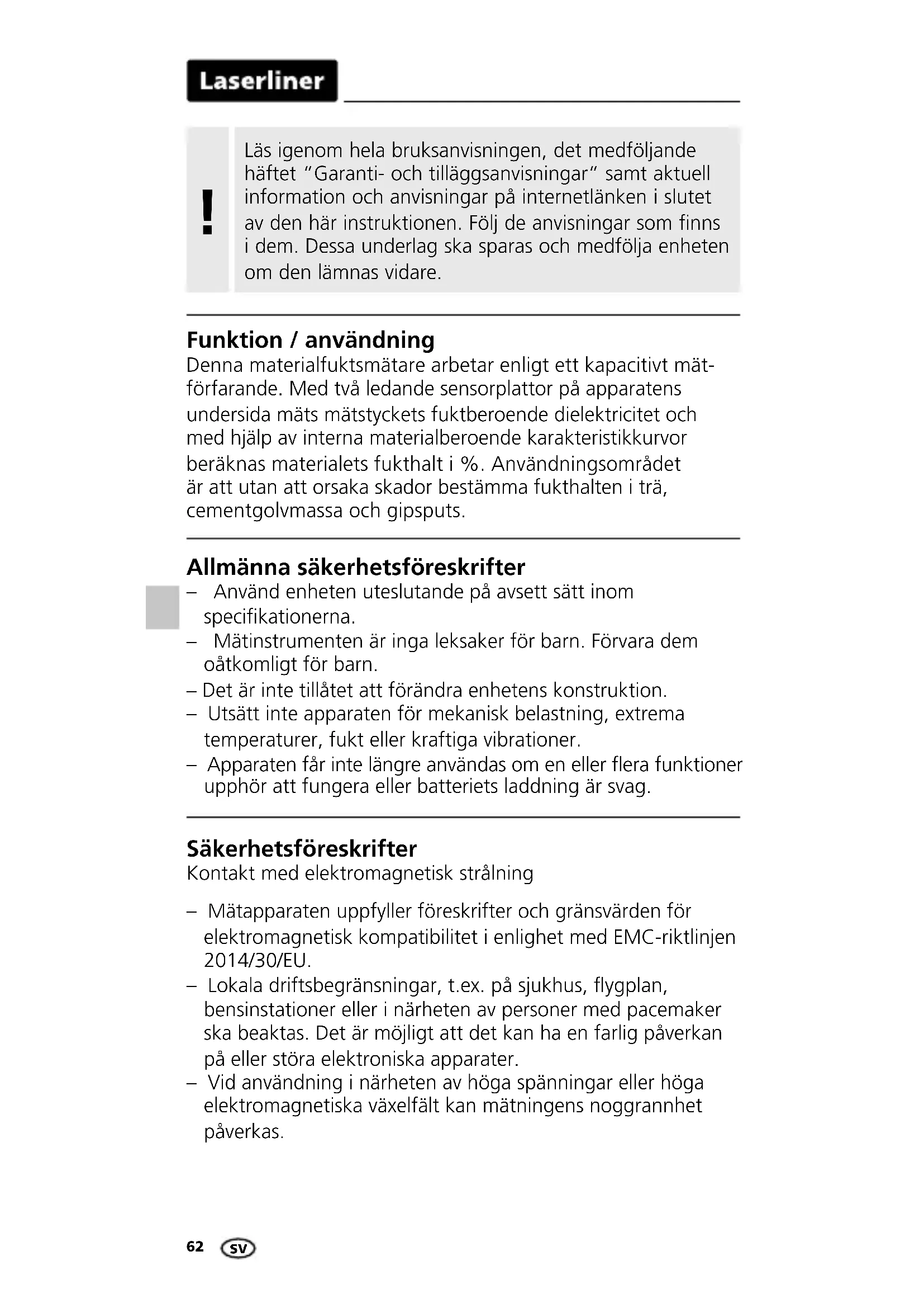 Allmänna säkerhetsföreskrifter – Använd enheten uteslutande på avsett sätt inom specikationerna. – Mätinstrumenten är inga leksaker för barn. Förvara dem oåtkomligt för barn. – Det är inte tillåtet att förändra enhetens konstruktion. – Utsätt inte apparaten för mekanisk belastning, extrema temperaturer, fukt eller kraftiga vibrationer. – Apparaten får inte längre användas om en eller era funktioner upphör att fungera eller batteriets laddning är svag. Säkerhetsföreskrifter Kontakt med elektromagnetisk strålning – Mätapparaten uppfyller föreskrifter och gränsvärden för elektromagnetisk kompatibilitet i enlighet med EMC-riktlinjen 2014/30/EU. – Lokala driftsbegränsningar, t.ex. på sjukhus, ygplan, bensinstationer eller i närheten av personer med pacemaker ska beaktas. Det är möjligt att det kan ha en farlig påverkan på eller störa elektroniska apparater. – Vid användning i närheten av höga spänningar eller höga elektromagnetiska växelfält kan mätningens noggrannhet påverkas.MoistureFinder Compact