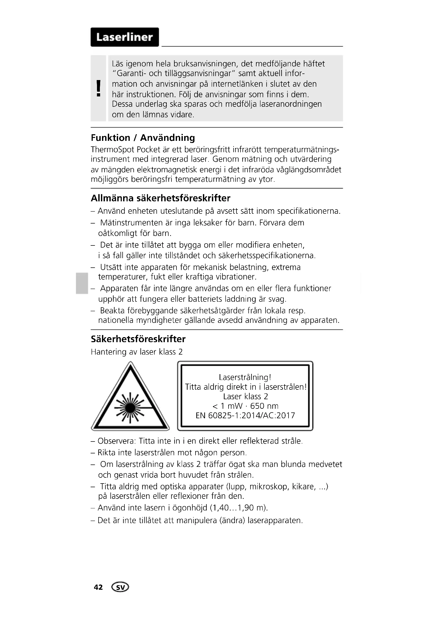 Funktion / Användning Allmänna säkerhetsföreskrifter Säkerhetsföreskrifter ThermoSpot Pocket är ett beröringsfritt infrarött temperaturmätnings- instrument med integrerad laser. Genom mätning och utvärdering av mängden elektromagnetisk energi i det infraröda våglängdsområdet möjliggörs beröringsfri temperaturmätning av ytor. – Använd enheten uteslutande på avsett sätt inom specifikationerna. – Mätinstrumenten är inga leksaker för barn. Förvara dem oåtkomligt för barn. – Det är inte tillåtet att bygga om eller modifiera enheten, i så fall gäller inte tillståndet och säkerhetsspecifikationerna. – Utsätt inte apparaten för mekanisk belastning, extrema temperaturer, fukt eller kraftiga vibrationer. – Apparaten får inte längre användas om en eller flera funktioner upphör att fungera eller batteriets laddning är svag. – Beakta förebyggande säkerhetsåtgärder från lokala resp. nationella myndigheter gällande avsedd användning av apparaten. – Observera: Titta inte in i en direkt eller reflekterad stråle. – Rikta inte laserstrålen mot någon person. – Om laserstrålning av klass 2 träffar ögat ska man blunda medvetet och genast vrida bort huvudet från strålen. – Titta aldrig med optiska apparater (lupp, mikroskop, kikare, ...) på laserstrålen eller reflexioner från den. – Använd inte lasern i ögonhöjd (1,40…1,90 m). – Det är inte tillåtet att manipulera (ändra) laserapparaten. Hantering av laser klass 2 Laserstrålning! Titta aldrig direkt in i laserstrålen! Laser klass 2 < 1 mW · 650 nm EN 60825-1:2014/AC:2017 SVThermoSpot Pocket