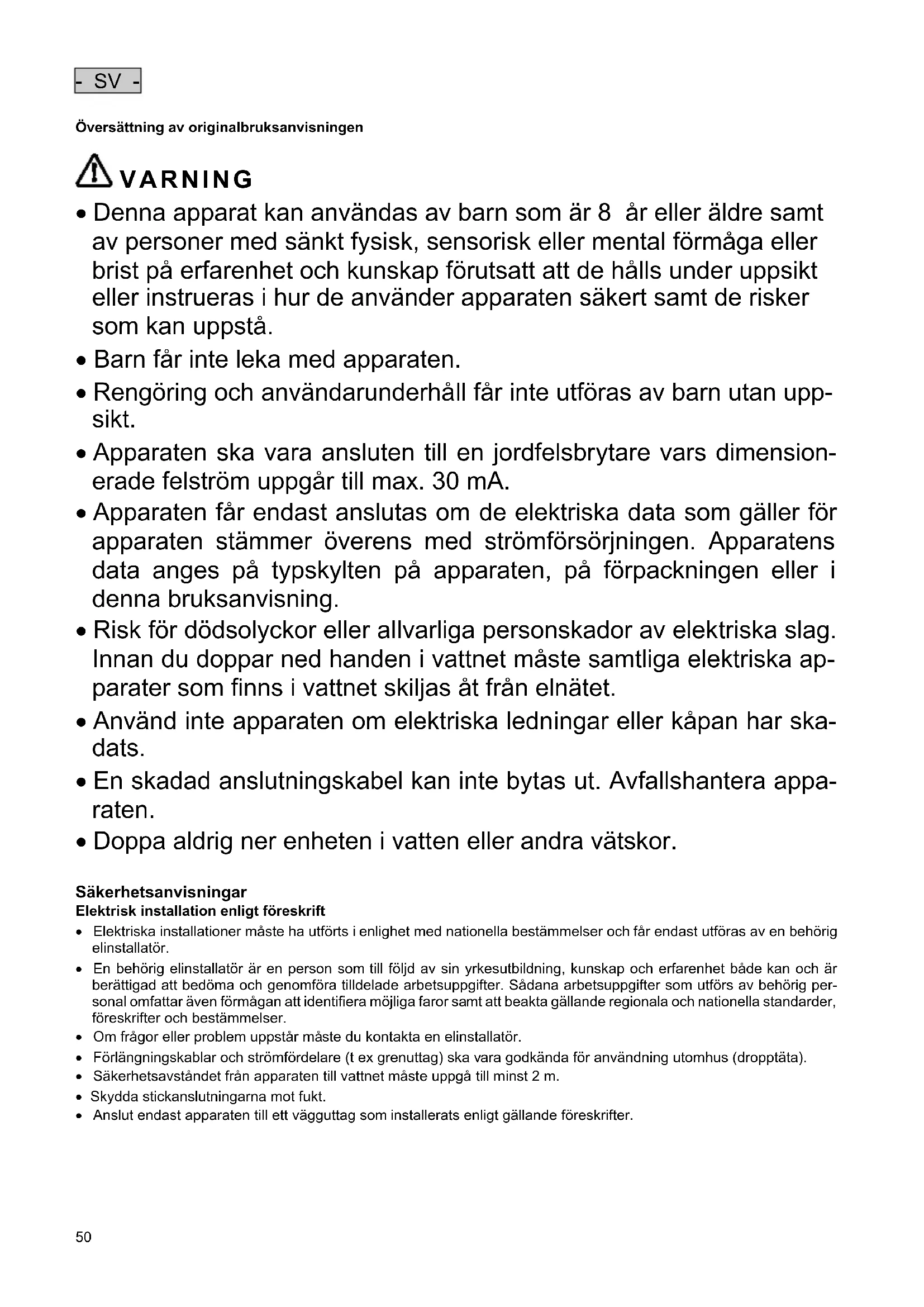 - Risk för dödsolyckor eller allvarliga personskador av elektriska slag. Innan du doppar ned handen i vattnet måste samtliga elektriska ap- parater som finns i vattnet skiljas åt från elnätet.