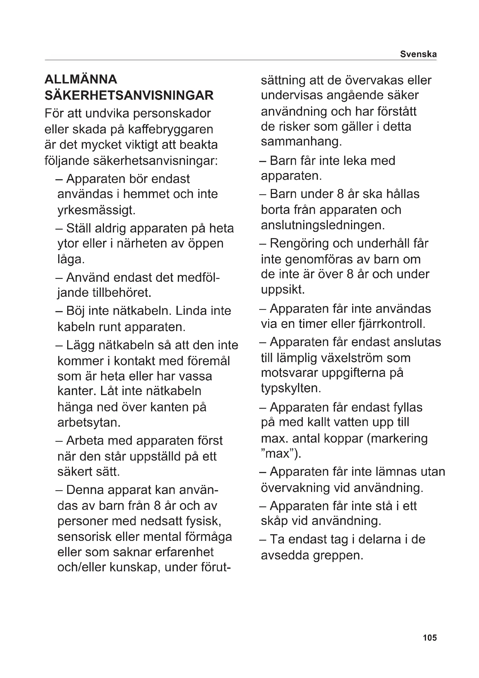 - Ställ kaebryggaren på ett jämnt, halkfritt, torrt underlag i omedelbar närhet till ett eluttag.