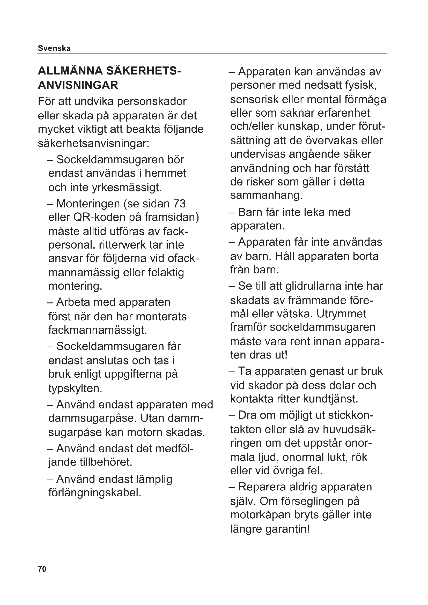 ANVISNINGAR För att undvika personskador eller skada på apparaten är det mycket viktigt att beakta följande säkerhetsanvisningar: – Sockeldammsugaren bör endast användas i hemmet och inte yrkesmässigt. – Monteringen (se sidan 73 eller QR-koden på framsidan) måste alltid utföras av fack- personal. ritterwerk tar inte ansvar för följderna vid ofack- mannamässig eller felaktig montering. – Arbeta med apparaten först när den har monterats fackmannamässigt. – Sockeldammsugaren får endast anslutas och tas i bruk enligt uppgifterna på typskylten. – Använd endast apparaten med dammsugarpåse. Utan damm- sugarpåse kan motorn skadas. – Använd endast det medföl- jande tillbehöret. – Använd endast lämplig förlängningskabel. – Apparaten kan användas av personer med nedsatt fysisk, sensorisk eller mental förmåga eller som saknar erfarenhet och/eller kunskap, under förut- sättning att de övervakas eller undervisas angående säker användning och har förstått de risker som gäller i detta sammanhang. – Barn får inte leka med apparaten. – Apparaten får inte användas av barn. Håll apparaten borta från barn. – Se till att glidrullarna inte har skadats av främmande före- mål eller vätska. Utrymmet framför sockeldammsugaren måste vara rent innan appara- ten dras ut! – Ta apparaten genast ur bruk vid skador på dess delar och kontakta ritter kundtjänst. – Dra om möjligt ut stickkon- takten eller slå av huvudsäk- ringen om det uppstår onor- mala ljud, onormal lukt, rök eller vid övriga fel. – Reparera aldrig apparaten själv. Om förseglingen på motorkåpan bryts gäller inte längre garantin!71 Svenska Risk för personskador – Använd aldrig den utdragna apparaten som trappsteg. – Snubbelrisk vid utdragen apparat! – Öppna aldrig motorrummet när motorn går.72 Svenska Läs noga igenom anvisningen innan apparaten tas i bruk. Spara bruksanvisningen och skicka med den när apparaten lämnas vidare. Den aktuella bruksanvisningen står även till förfogande på www.ritterwerk.de. ANVÄNDNING Sockeldammsugaren är avsedd för snabb borttagning av smulor och damm i köket. Ej avsett bruk eller felak- tig användning kan leda till svåra personskador eller skada på apparaten. I sådana fall gäller inga garanti- eller ansvarsanspråk. DAMMSUGNING