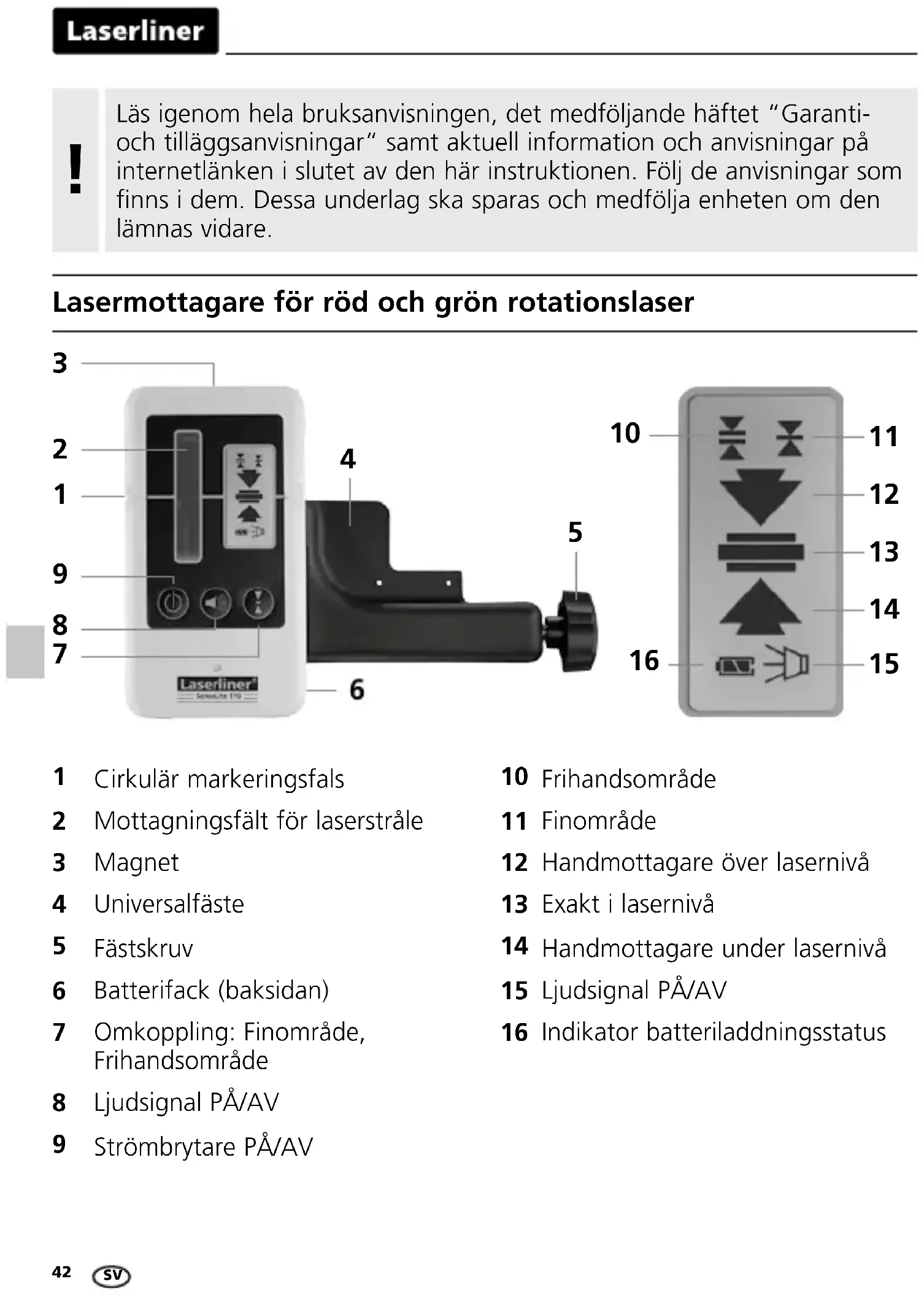 Lasermottagare för röd och grön rotationslaser Cirkulär markeringsfals Mottagningsfält för laserstråle Magnet Universalfäste Fästskruv Batterifack (baksidan) Omkoppling: Finområde, Frihandsområde Ljudsignal PÅ/AV Strömbrytare PÅ/AV Frihandsområde Finområde Handmottagare över lasernivå Exakt i lasernivå Handmottagare under lasernivå Ljudsignal PÅ/AV Indikator batteriladdningsstatus SVSensoLite 110 / SensoLite 110 G