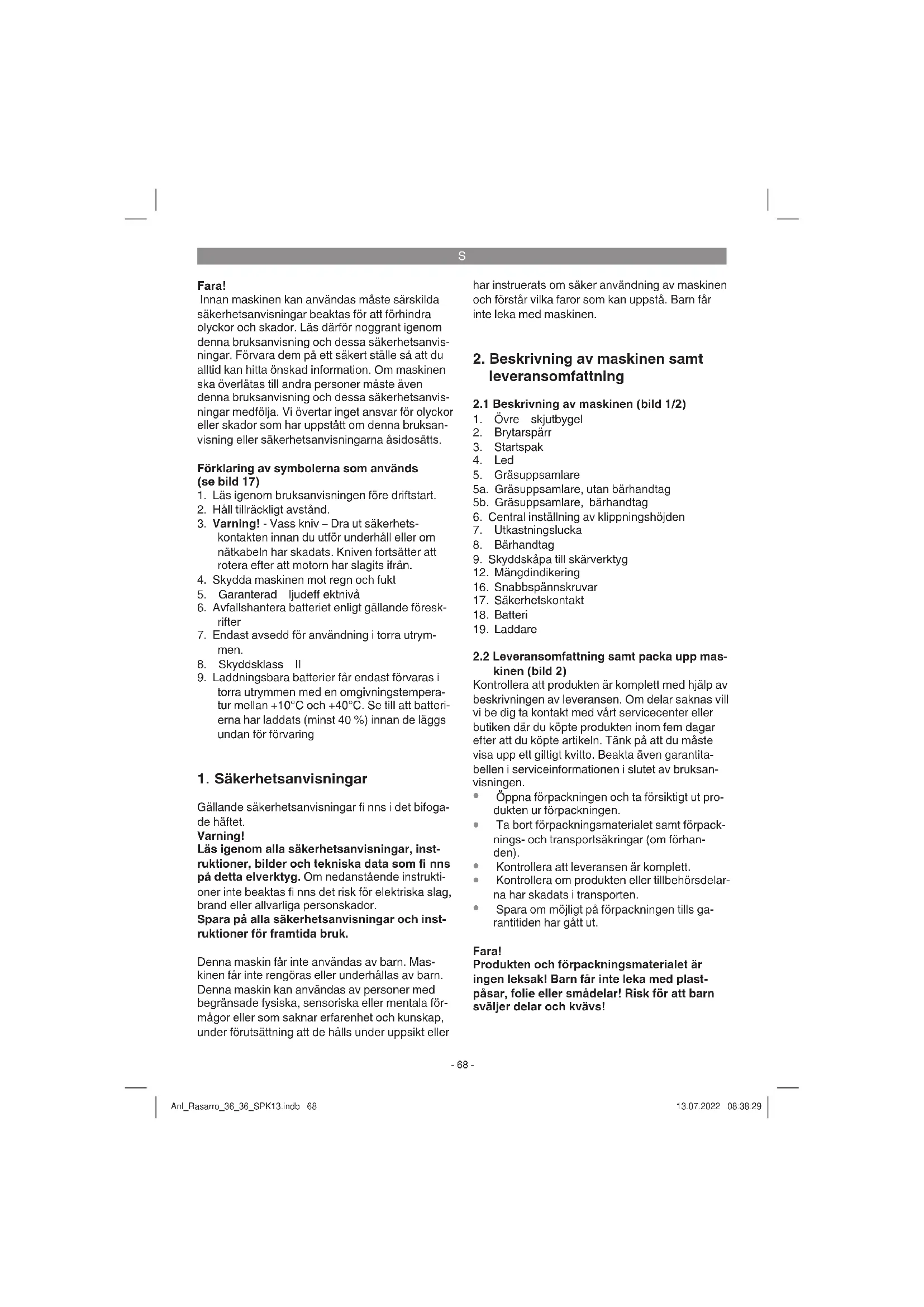 Spara om möjligt på förpackningen tills ga- rantitiden har gått ut. Fara! Produkten och förpackningsmaterialet är ingen leksak! Barn får inte leka med plast- påsar, folie eller smådelar! Risk för att barn sväljer delar och kvävs! Anl_Rasarro_36_36_SPK13.indb 68Anl_Rasarro_36_36_SPK13.indb 68 13.07.2022 08:38:2913.07.2022 08:38:29S