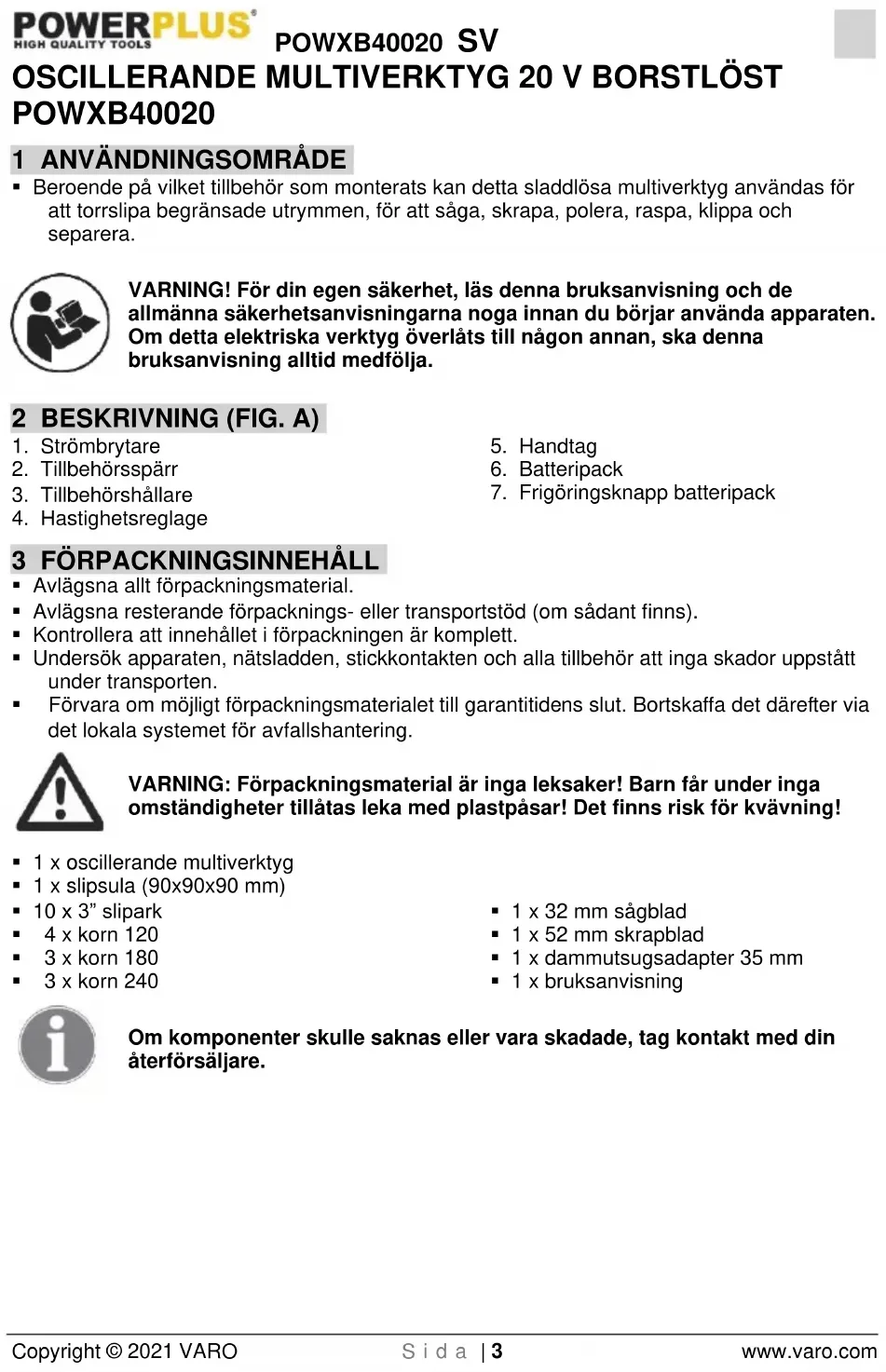- När du kasserar batterier, följ instruktionerna i avsnittet "Miljöhänsyn".POWXB40020 SV Copyright © 2021 VARO S i d a | 8 www.varo.com