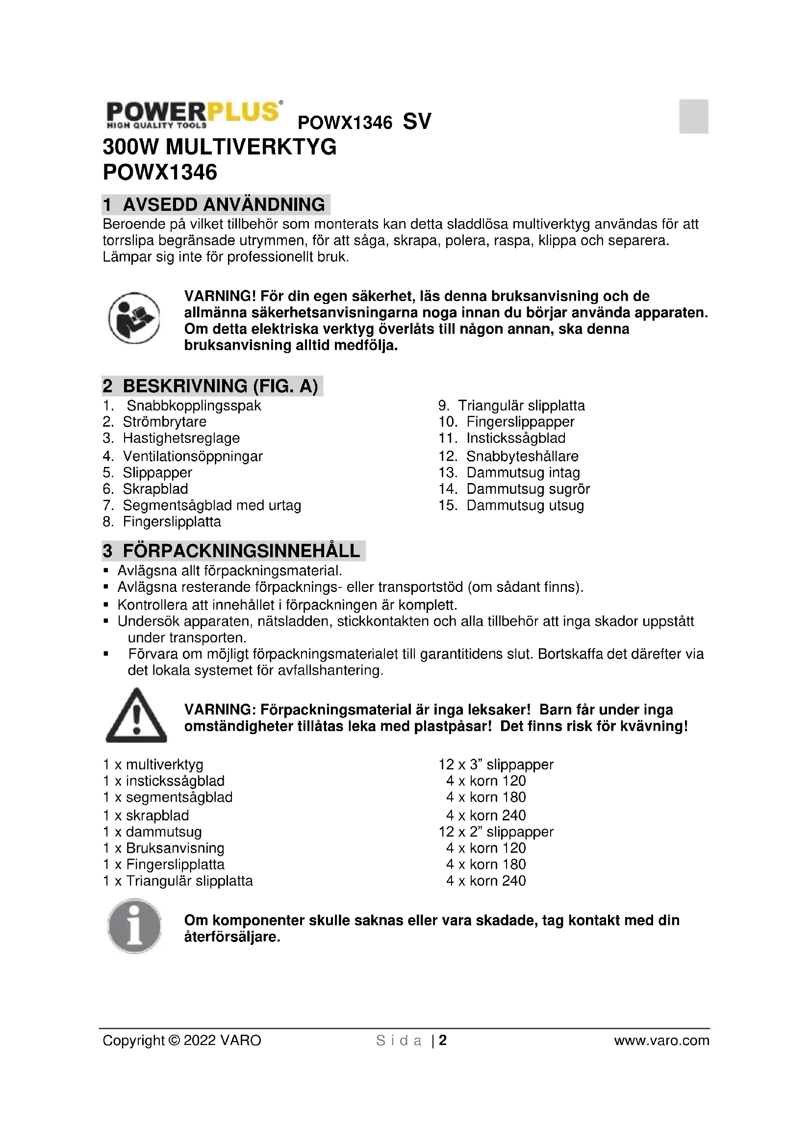 - Låt endast kvalificerat fackfolk reparera verktyget med användande av originalreservdelar. Detta för att garantera att verktygets säkerhetsstandards vidmakthålls.POWX1346 SV Copyright © 2022 VARO S i d a | 5 www.varo.com