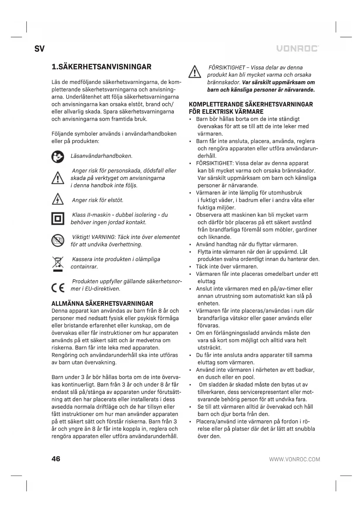 gallret (3) är blockerat Håll värmaren långt från föremål som gardin, plastpåse, pap- per och andra saker som kan täcka intaget eller kan hindra luftintaget Apparaten värms inte upp, bara fläkten fungerar Omkopplaren har inte ställts in på värmein- ställningen Vrid omkopplaren till värmein- ställning Termostaten aktiverades Vrid termostaten och lyssna om det finns öppen/stäng-signal. Om det inte hörs något klick och termostaten inte är skadad, slås värmaren på automatiskt när apparaten svalnat Den auto- matiska avstängningen fungerade Stäng av värmaren och inspek- tera blockering av inlopp eller utlopp. Koppla ur kontakten och vänta minst 10 minuter tills skyddssystemet återställs innan du försöker starta om värmaren. Onormalt ljud Apparaten står inte upp Ställ värmaren på en plan yta MILJÖ Felaktig och/eller kasserad elektrisk eller elektronisk utrustning måste lämnas in på lämpliga återvinningsstationer. Endast för EU-länder Kassera inte elverktyg ihushållsavfall. Enligt den europeiska riktlinjen 2012/19/EU om kasserad elektrisk och elektronisk utrustning och dess till- lämpning inationell rätt måste elverktyg som inte längre är användbara samlas in separat och kas- seras på ett miljövänligt sätt. GARANTI VONROC-produkter är utvecklade enligt högsta kvalitetsstandard och garanteras fria från defekter ibåde material och utförande under den period som lagen föreskriver från och med inköpsda- tumet. Om produkten skulle utveckla fel under denna period på grund av defekt material och/eller utförande, kontakta då VONROC direkt. Följande omständigheter är undantagna från denna garanti: