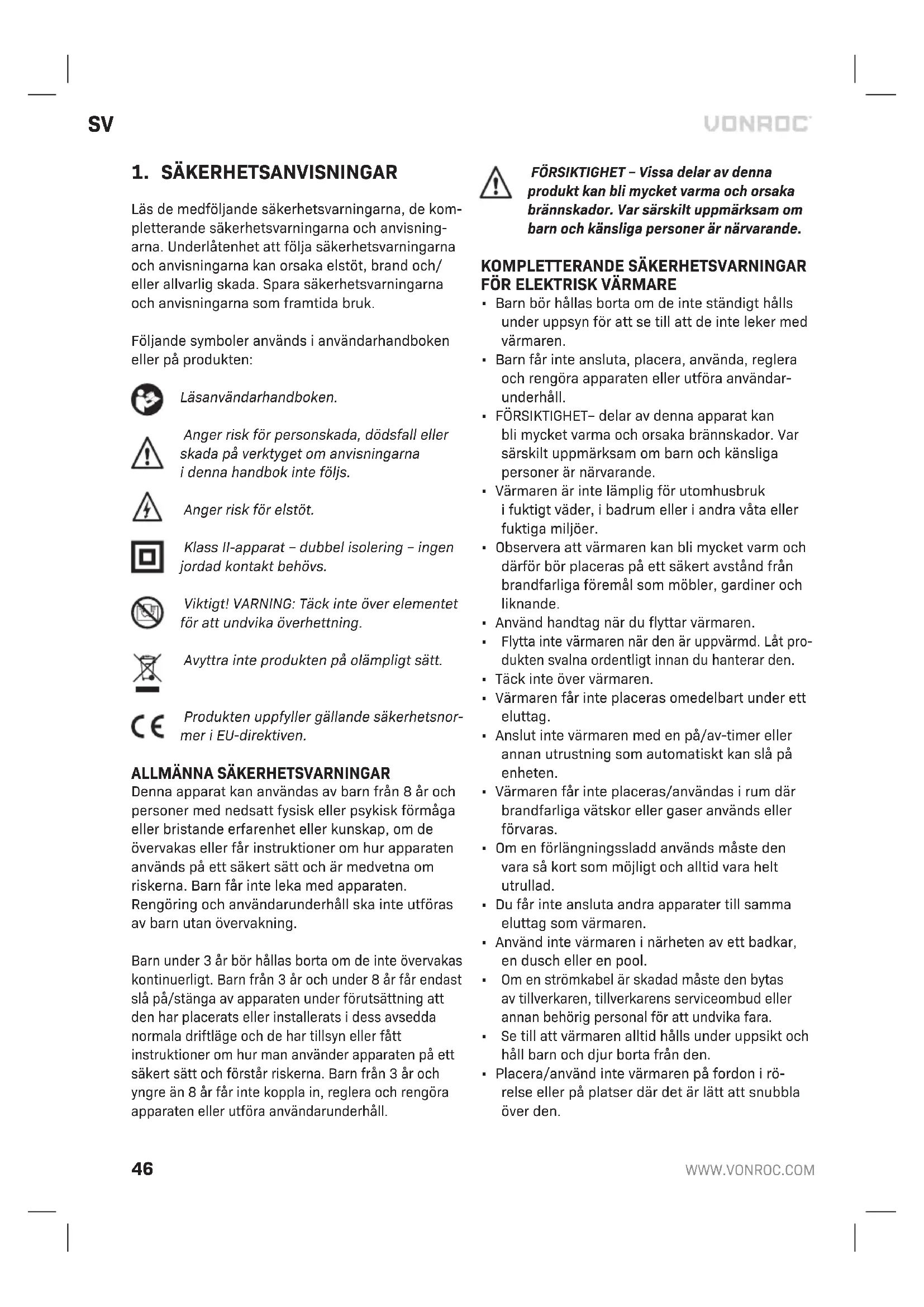 gallret (3) är blockerat Håll värmaren långt från föremål som gardin, plastpåse, papper och andra saker som kan täcka intaget eller kan hindra luftintaget Problem Möjlig orsak Lösning Apparaten värms inte upp, bara fläkten fungerar Omkopplaren har inte ställts in på värmein- ställningen Vrid omkopplaren till värmeinställning Termostaten aktiverades Vrid termostaten och lyssna om det finns öppen/stäng-signal. Om det inte hörs något klick och termostaten inte är skadad, slås värmaren på automatiskt när apparaten svalnat Den auto- matiska avstängningen fungerade Stäng av värmaren och inspektera blockering av inlopp eller utlopp. Koppla ur kontakten och vänta minst 10 minuter tills skyddssystemet återställs innan du försöker starta om värmaren. Onormalt ljud Apparaten står inte upp Ställ värmaren på en plan yta MILJÖ Felaktig och/eller kasserad elektrisk eller elektronisk utrustning måste lämnas in på lämpliga återvinningsstationer. Endast för EU-länder Kassera inte elverktyg ihushållsavfall. Enligt den europeiska riktlinjen 2012/19/EU om kasserad elektrisk och elektronisk utrustning och dess tillämpning inationell rätt måste elverktyg som inte längre är användbara samlas in separat och kasseras på ett miljövänligt sätt. GARANTI VONROC-produkter är utvecklade enligt högsta kvalitetsstandard och garanteras fria från defekter ibåde material och utförande under den period som lagen föreskriver från och med inköpsdatumet. Om produkten skulle utveckla fel under denna peri- od på grund av defekt material och/eller utförande, kontakta då VONROC direkt. Följande omständigheter är undantagna från denna garanti: