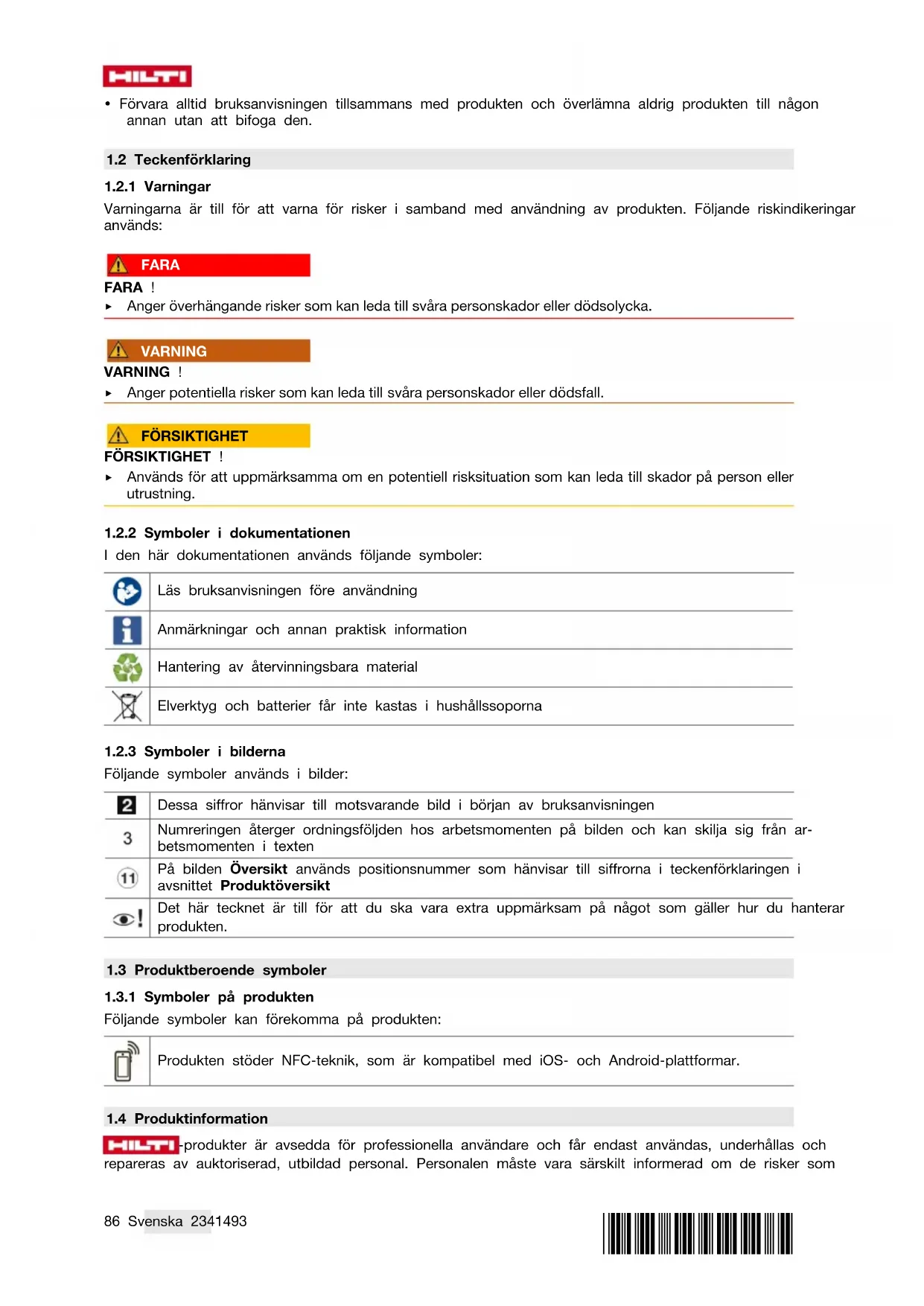 - Observera de säkerhets- och varningsanvisningar som du hittar i denna bruksanvisning och på produkten.86 Svenska 2341493 *2341493*