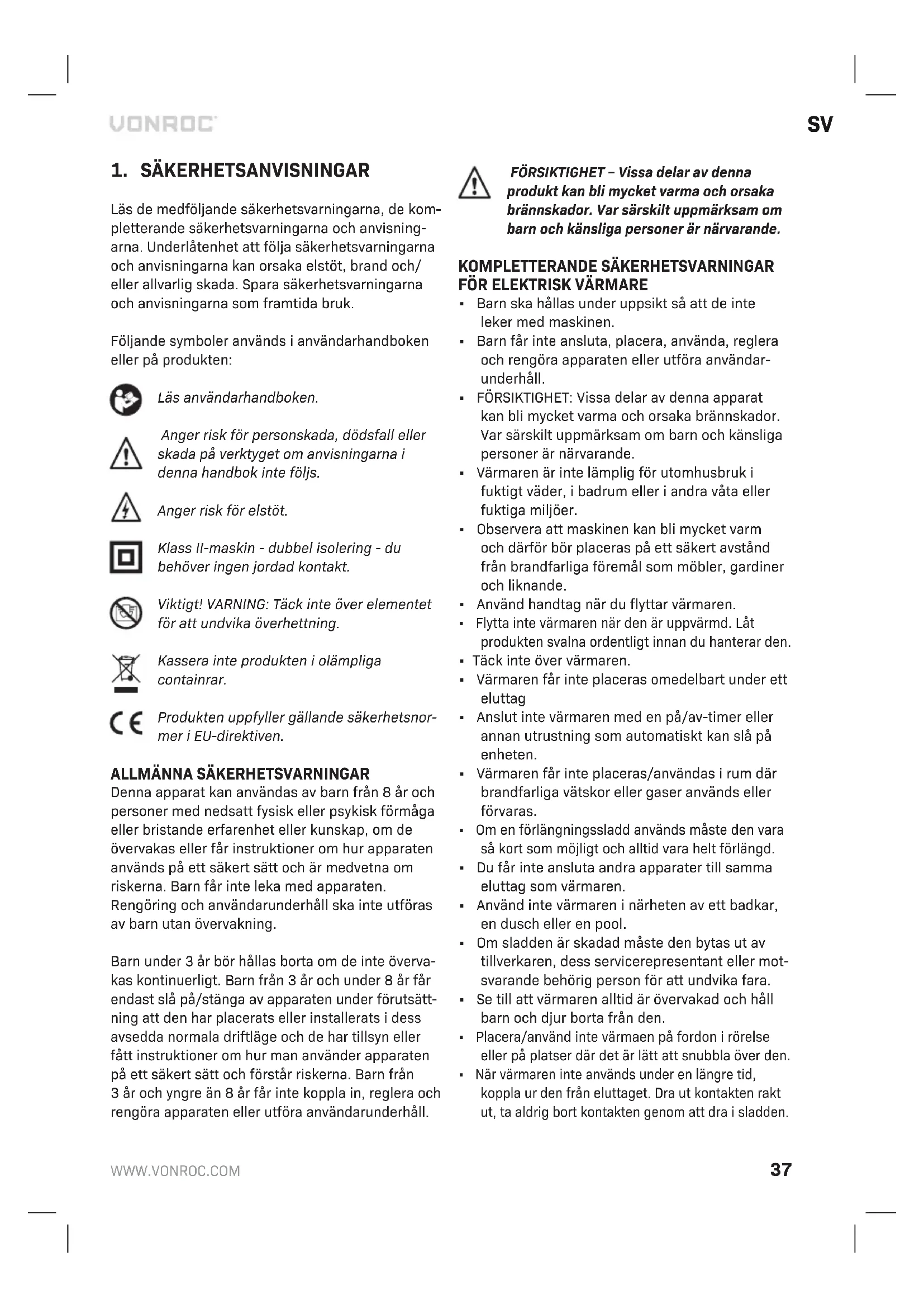 Apparaten värms inte upp, bara fläkten fungerar Omkoppla- ren har inte ställts in på värmeinställ- ningen Vrid omkopplaren till vär- meinställning Termostaten aktiverades Vrid termostaten och lyssna om det finns öppen/stäng-signal. Om det inte hörs något klick och termostaten inte är skadad, slås värmaren på automatiskt när apparaten svalnat Den auto- matiska avstängningen fungerade Stäng av värmaren och inspek- tera blockering av inlopp eller utlopp. Koppla ur kontakten och vänta minst 10 minuter tills sky- ddssystemet återställs innan du försöker starta om värmaren. Onormalt ljud Apparaten står inte upp Ställ värmaren på en plan yta MILJÖ Felaktig och/eller kasserad elektrisk eller elektronisk utrustning måste lämnas in på lämpliga återvinningsstationer. Endast för EU-länder Kassera inte elverktyg i hushållsavfall. Enligt den europeiska riktlinjen 2012/19/EU om kasserad elektrisk och elektronisk utrustning och dess tillämpning i nationell rätt måste elverktyg som inte längre är användbara samlas in separat och kasseras på ett miljövänligt sätt. GARANTI VONROC-produkter är utvecklade enligt högsta kvalitetsstandard och garanteras fria från defekter i både material och utförande under den period som lagen föreskriver från och med inköpsdatumet. Om produkten skulle utveckla fel under denna period på grund av defekt material och/eller utförande, kontakta då VONROC direkt. Följande omständigheter är undantagna från denna garanti:
