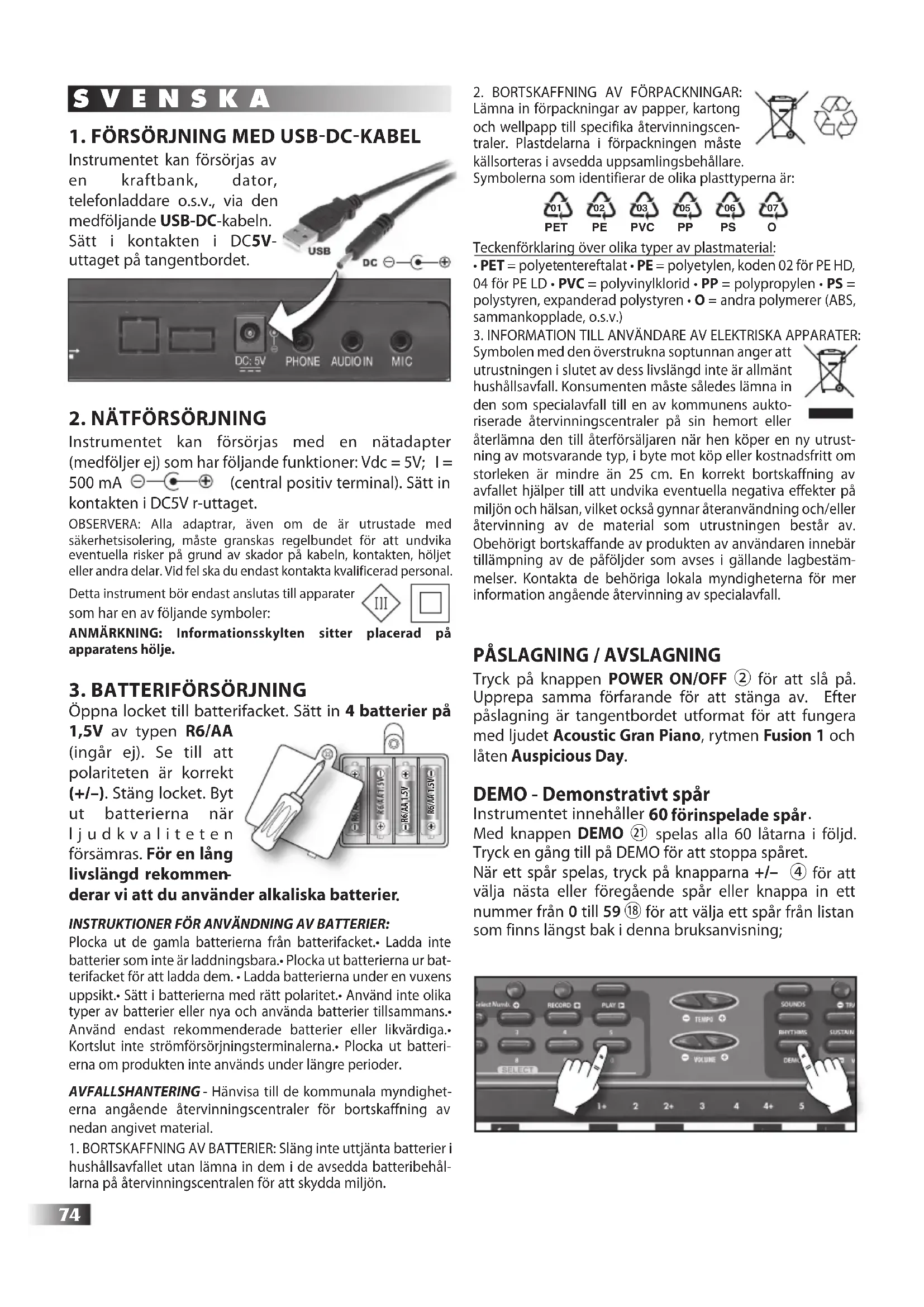 Med knappen DEMO ㉑ spelas alla 60 låtarna i följd. Tryck en gång till på DEMO för att stoppa spåret. När ett spår spelas, tryck på knapparna +/– ④ för att välja nästa eller föregående spår eller knappa in ett nummer från 0 till 59 ⑱ för att välja ett spår från listan som finns längst bak i denna bruksanvisning; S V E N S K A R6/AA 1.5VR6/AA 1.5VR6/AA 1.5VR6/AA 1.5VR6/AA 1.5VR6/AA 1.5VR6/AA 1.5VR6/AA 1.5V