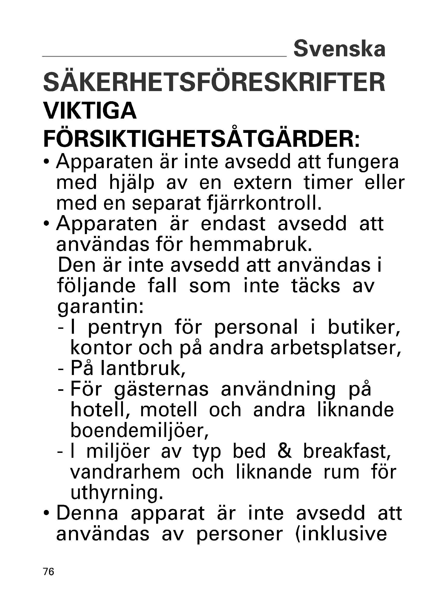 - Apparaten är endast avsedd att användas för hemmabruk. Den är inte avsedd att användas i följande fall som inte täcks av garantin: - I pentryn för personal i butiker, kontor och på andra arbetsplatser, - På lantbruk, - För gästernas användning på hotell, motell och andra liknande boendemiljöer,