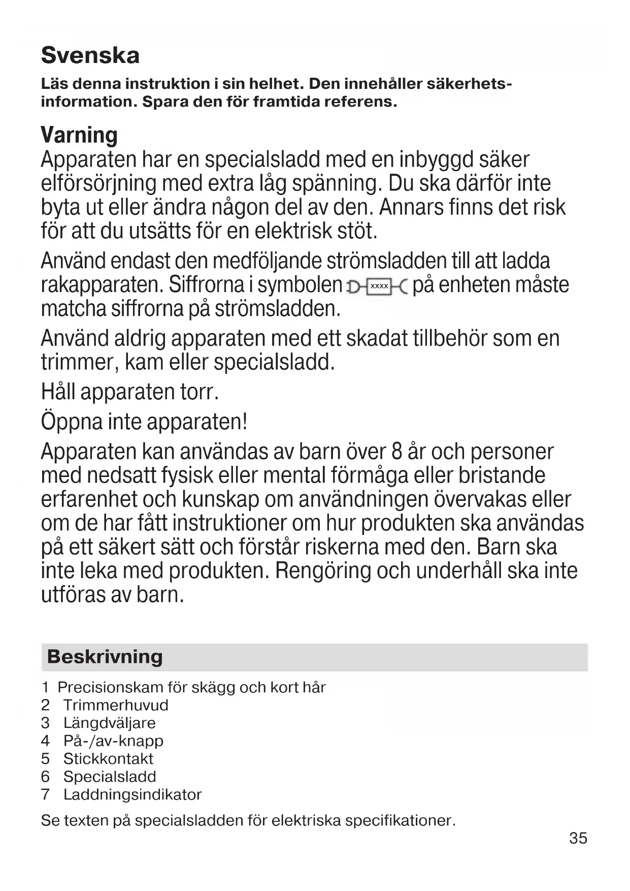 For varer kjøpt i Norge har kunden garanti i henhold til NEL’s Leveringsbe- tingelser. 90618446_Type5516_BT_3222_3221_3220_MN_ANZ.indd 3490618446_Type5516_BT_3222_3221_3220_MN_ANZ.indd 34 17.06.19 13:4217.06.19 13:42 Business Use - P&G AUTHORIZED POA-00141023 Rev 001 Effective Date 2019-06-24 Printed 2022-01-12 Page 34 of 4435 Svenska Läs denna instruktion i sin helhet. Den innehåller säkerhets- information. Spara den för framtida referens. Varning Apparaten har en specialsladd med en inbyggd säker elförsörjning med extra låg spänning. Du ska därför inte byta ut eller ändra någon del av den. Annars finns det risk för att du utsätts för en elektrisk stöt. Använd endast den medföljande strömsladden till att ladda rakapparaten. Siffrorna i symbolen xxxx på enheten måste matcha siffrorna på strömsladden. Använd aldrig apparaten med ett skadat tillbehör som en trimmer, kam eller specialsladd. Håll apparaten torr. Öppna inte apparaten! Apparaten kan användas av barn över 8 år och personer med nedsatt fysisk eller mental förmåga eller bristande erfarenhet och kunskap om användningen övervakas eller om de har fått instruktioner om hur produkten ska användas på ett säkert sätt och förstår riskerna med den. Barn ska inte leka med produkten. Rengöring och underhåll ska inte utföras av barn. Beskrivning 1 Precisionskam för skägg och kort hår 2 Trimmerhuvud 3 Längdväljare 4 På-/av-knapp 5 Stickkontakt 6 Specialsladd 7 Laddningsindikator Se texten på specialsladden för elektriska specifikationer. 90618446_Type5516_BT_3222_3221_3220_MN_ANZ.indd 3590618446_Type5516_BT_3222_3221_3220_MN_ANZ.indd 35 17.06.19 13:4217.06.19 13:42 Business Use - P&G AUTHORIZED POA-00141023 Rev 001 Effective Date 2019-06-24 Printed 2022-01-12 Page 35 of 4436 Laddning Rekommenderad omgivningstemperatur vid laddning är 5 °C till 35 °C. Vid extremt låga eller höga temperaturer kan det hända att batteriet inte laddas ordentligt eller inte laddas alls. Rekommenderad omgivningstempe- ratur för trimning är 15°C till 35°C. Rakapparaten får inte utsättas för tempe- raturer överstigande 50°C under en längre tid.