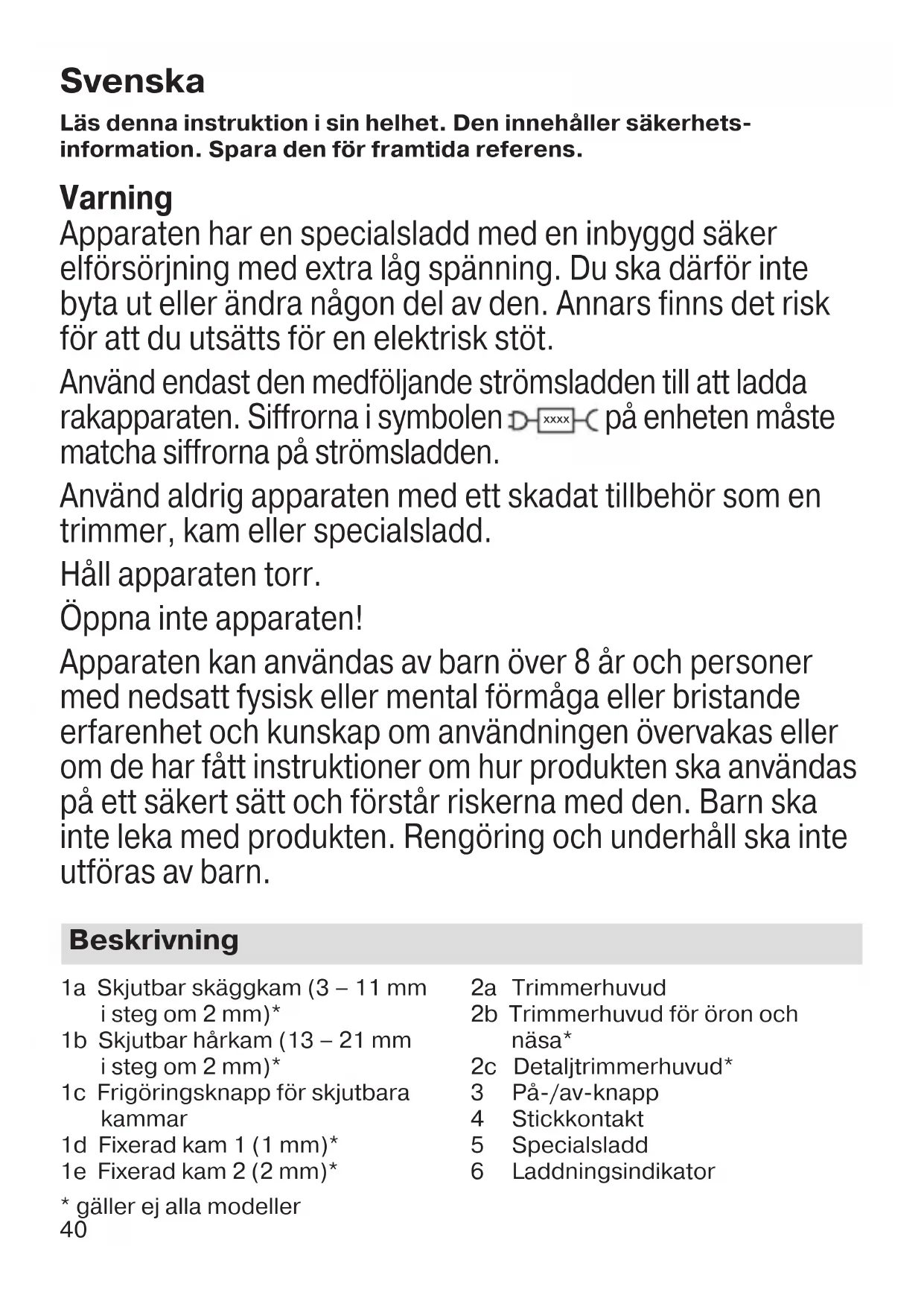 For varer kjøpt i Norge har kunden garanti i henhold til NEL’s Leveringsbe- tingelser. 90640284_Type5513_MGK3225_3221_3220_MN_ANZ.indd 3990640284_Type5513_MGK3225_3221_3220_MN_ANZ.indd 39 13.06.19 14:4213.06.19 14:42 Business Use - P&G AUTHORIZED POA-00139280 Rev 001 Effective Date 2019-06-17 Printed 2020-05-04 Page 39 of 5640 Svenska Läs denna instruktion i sin helhet. Den innehåller säkerhets- information. Spara den för framtida referens. Varning Apparaten har en specialsladd med en inbyggd säker elförsörjning med extra låg spänning. Du ska därför inte byta ut eller ändra någon del av den. Annars finns det risk för att du utsätts för en elektrisk stöt. Använd endast den medföljande strömsladden till att ladda rakapparaten. Siffrorna i symbolen xxxx på enheten måste matcha siffrorna på strömsladden. Använd aldrig apparaten med ett skadat tillbehör som en trimmer, kam eller specialsladd. Håll apparaten torr. Öppna inte apparaten! Apparaten kan användas av barn över 8 år och personer med nedsatt fysisk eller mental förmåga eller bristande erfarenhet och kunskap om användningen övervakas eller om de har fått instruktioner om hur produkten ska användas på ett säkert sätt och förstår riskerna med den. Barn ska inte leka med produkten. Rengöring och underhåll ska inte utföras av barn. Beskrivning 1a Skjutbar skäggkam (3 – 11 mm i steg om 2 mm)* 1b Skjutbar hårkam (13 – 21 mm i steg om 2 mm)* 1c Frigöringsknapp för skjutbara kammar 1d Fixerad kam 1 (1 mm)* 1e Fixerad kam 2 (2 mm)* 2a Trimmerhuvud 2b Trimmerhuvud för öron och näsa* 2c Detaljtrimmerhuvud* 3 På-/av-knapp 4 Stickkontakt 5 Specialsladd 6 Laddningsindikator