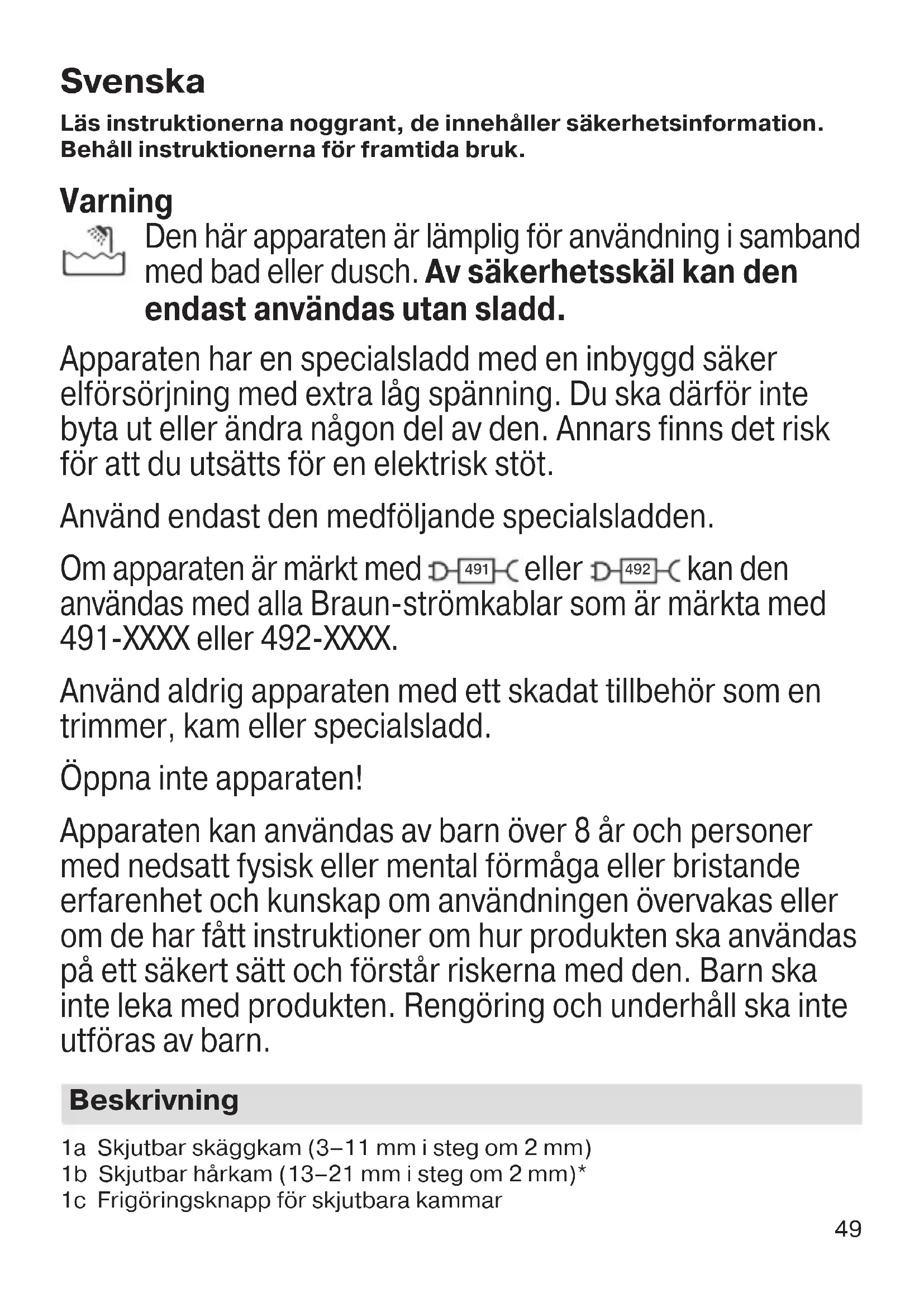 kan den användas med alla Braun-strömkablar som är märkta med 491-XXXX eller 492-XXXX. Använd aldrig apparaten med ett skadat tillbehör som en trimmer, kam eller specialsladd. Öppna inte apparaten! Apparaten kan användas av barn över 8 år och personer med nedsatt fysisk eller mental förmåga eller bristande erfarenhet och kunskap om användningen övervakas eller om de har fått instruktioner om hur produkten ska användas på ett säkert sätt och förstår riskerna med den. Barn ska inte leka med produkten. Rengöring och underhåll ska inte utföras av barn. Beskrivning 1a Skjutbar skäggkam (3–11 mm i steg om 2 mm) 1b Skjutbar hårkam (13–21 mm i steg om 2 mm)* 1c Frigöringsknapp för skjutbara kammar 90590980_MGK7221MGK7220MGK7920MGK5280 MN_ANZ.indd 4990590980_MGK7221MGK7220MGK7920MGK5280 MN_ANZ.indd 49 11.06.19 12:0011.06.19 12:00 Business Use - P&G AUTHORIZED POA-00138563 Rev 001 Effective Date 2019-06-13 Printed 2022-03-31 Page 49 of 6450 1d Fixerad kam 1 (1 mm)* 1e Fixerad kam 2 (2 mm)* 2a Trimmerhuvud 2b Trimmerhuvud för öron och näsa* 2c Detaljtrimmerhuvud* 2d Trimmerhuvud för kroppen* 2e Mini-rakhuvud med skärblad* 3 På/av-knapp 4 Laddningsindikator 5 Stickkontakt 6 Specialsladd (utformning kan skifta) 7 Laddningsställ*