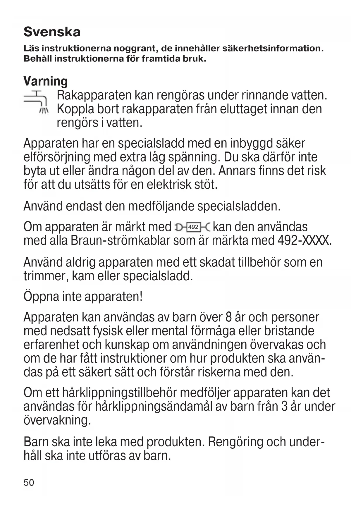 For varer kjøpt i Norge har kunden garanti i henhold til NEL’s Leveringsbe- tingelser. 90012280_Type5542_BT_7350_7340_7330_7320_5365_5360_5342_5340_MN_ANZ.indd 4990012280_Type5542_BT_7350_7340_7330_7320_5365_5360_5342_5340_MN_ANZ.indd 49 13.09.21 09:1913.09.21 09:1950 Svenska Läs instruktionerna noggrant, de innehåller säkerhetsinformation. Behåll instruktionerna för framtida bruk. Varning Rakapparaten kan rengöras under rinnande vatten. Koppla bort rakapparaten från eluttaget innan den rengörs i vatten. Apparaten har en specialsladd med en inbyggd säker elförsörjning med extra låg spänning. Du ska därför inte byta ut eller ändra någon del av den. Annars finns det risk för att du utsätts för en elektrisk stöt. Använd endast den medföljande specialsladden. Om apparaten är märkt med