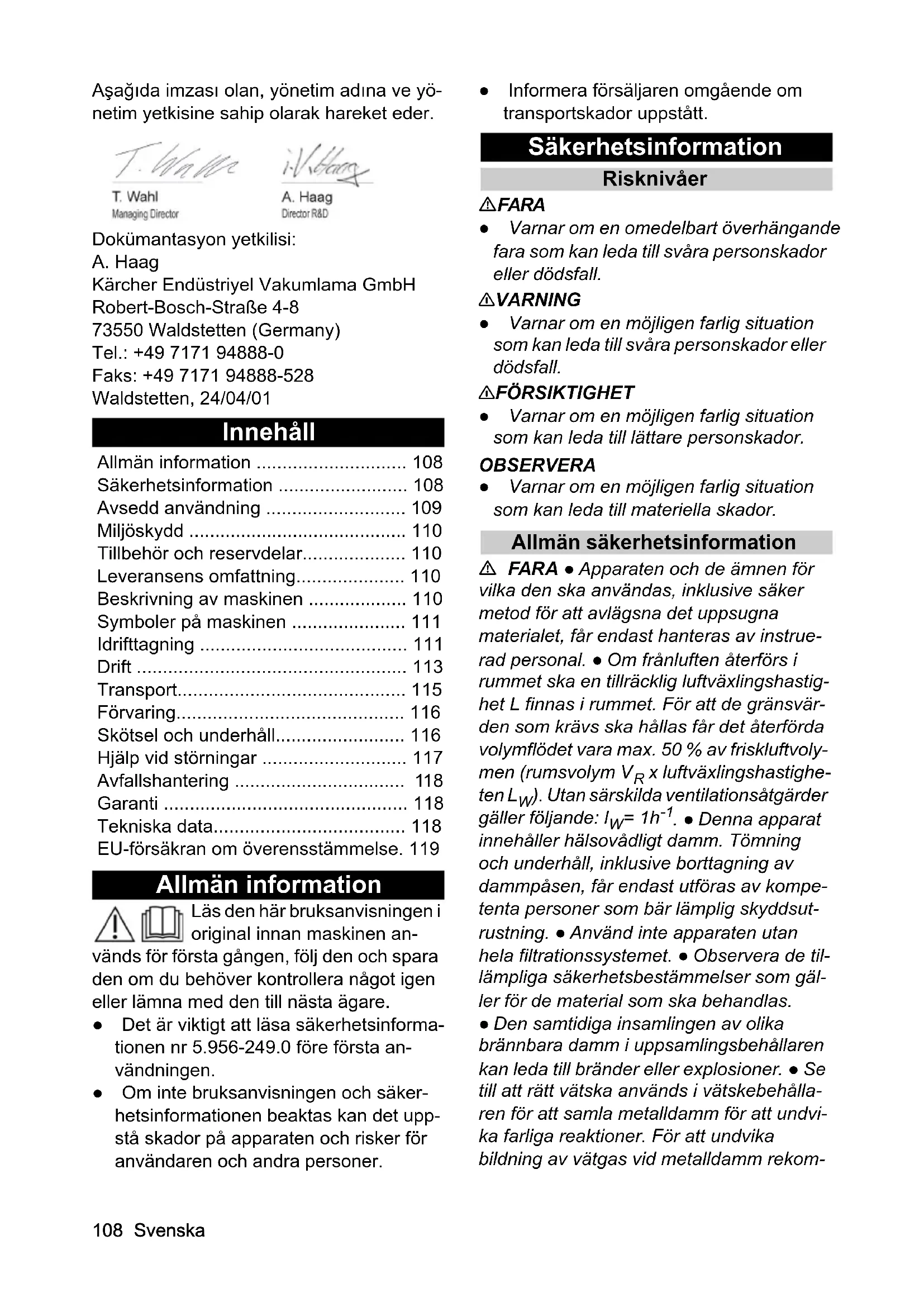 Kablo uzunluğum10108 Svenska Aşağıda imzası olan, yönetim adına ve yö- netim yetkisine sahip olarak hareket eder. Dokümantasyon yetkilisi: A. Haag Kärcher Endüstriyel Vakumlama GmbH Robert-Bosch-Straße 4-8 73550 Waldstetten (Germany) Tel.: +49 7171 94888-0 Faks: +49 7171 94888-528 Waldstetten, 24/04/01 Innehåll Allmän information Läs den här bruksanvisningen i original innan maskinen an- vänds för första gången, följ den och spara den om du behöver kontrollera något igen eller lämna med den till nästa ägare. ● Det är viktigt att läsa säkerhetsinforma- tionen nr 5.956-249.0 före första an- vändningen. ● Om inte bruksanvisningen och säker- hetsinformationen beaktas kan det upp- stå skador på apparaten och risker för användaren och andra personer. ● Informera försäljaren omgående om transportskador uppstått. Säkerhetsinformation Risknivåer FARA ● Varnar om en omedelbart överhängande fara som kan leda till svåra personskador eller dödsfall. 몇 VARNING ● Varnar om en möjligen farlig situation som kan leda till svåra personskador eller dödsfall. 몇 FÖRSIKTIGHET ● Varnar om en möjligen farlig situation som kan leda till lättare personskador. OBSERVERA ● Varnar om en möjligen farlig situation som kan leda till materiella skador. Allmän säkerhetsinformation FARA ● Apparaten och de ämnen för vilka den ska användas, inklusive säker metod för att avlägsna det uppsugna materialet, får endast hanteras av instrue- rad personal. ● Om frånluften återförs i rummet ska en tillräcklig luftväxlingshastig- het L finnas i rummet. För att de gränsvär- den som krävs ska hållas får det återförda volymflödet vara max. 50 % av friskluftvoly- men (rumsvolym V