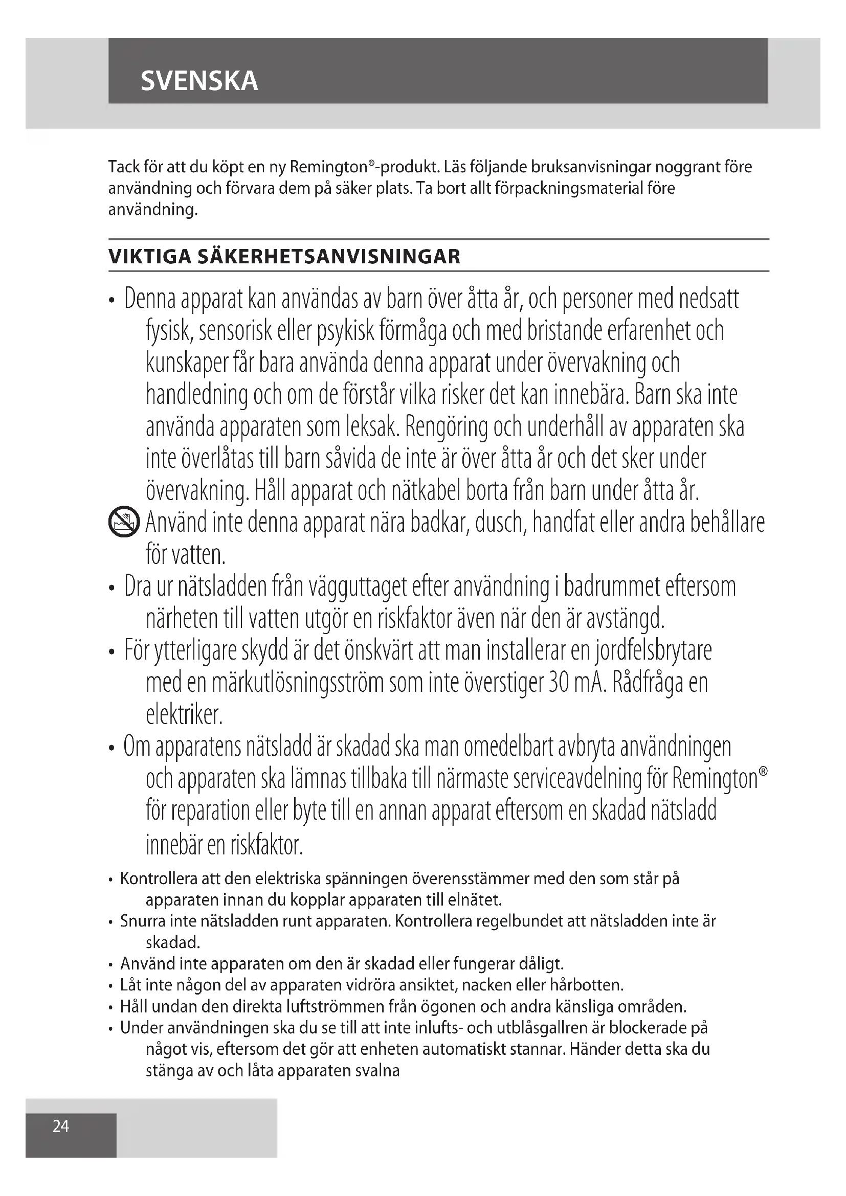 AE24 SVENSKA Tack för att du köpt en ny Remington®-produkt. Läs följande bruksanvisningar noggrant före användning och förvara dem på säker plats. Ta bort allt förpackningsmaterial före användning.