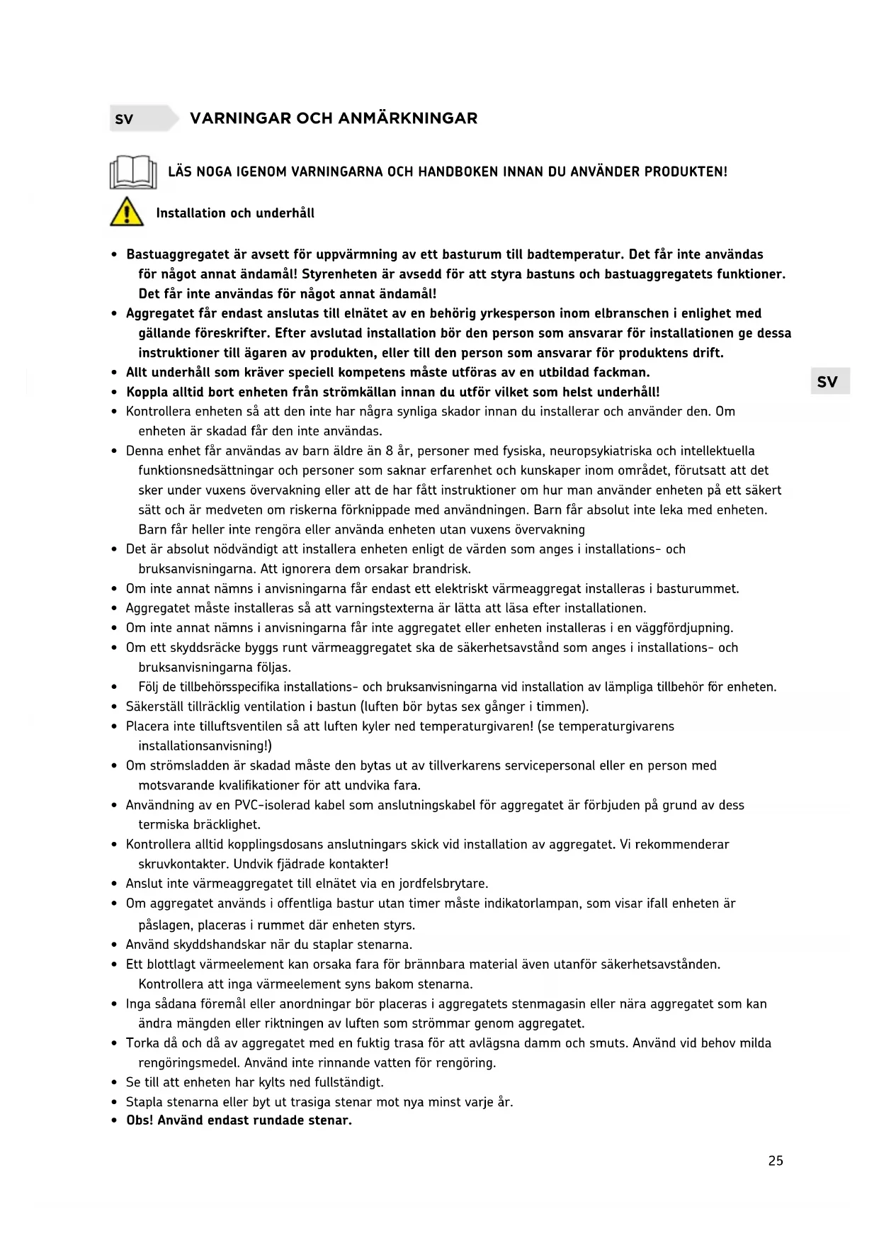 Underhåll: På grund av de kraftiga temperaturskillnaderna söndervittras och söndersmulas bastustenarna med tiden. Stapla stenarna på nytt minst en gång per år och oftare än så ju oftare bastun används. Ta samtidigt bort stenresterna som ackumulerats i stenmagasinet och byt ut stenar som gått sönder. På det här sättet säkerställer du att aggregatets badegenskaper bibehålls och att ingen risk för överhettning uppstår. Var särskilt uppmärksam på om stenarna i stenmagasinet sjunker ihop. Se till att värmeelementen inte friläggs med tiden. Stenarna sjunker snabbast inom cirka två månader efter ibruktagandet. Uppvärmning av basturummet Första gången de används, ger aggregatet och stenarna ifrån sig lukter och för att få bort dessa lukter ska du säkerställa god ventilation av basturummet. Om aggregatets effekt är lämplig för basturummet, värms ett välisolerat basturum upp till användningsklar temperatur på cirka en timme. Bastustenarna värms vanligtvis upp i samma takt som basturummet. En lämplig temperatur för basturummet är cirka 65–80 °C. Användning av aggregatet Kontrollera alltid att inga föremål finns på eller i närheten av aggregatet innan den kopplas på. Aggregatmodellerna styrs med hjälp av en separat styrenhet. Bekanta dig med användaranvisningar som följer med styrenheten. Kasta bad Luften i bastun torkar då bastun värms upp. På grund av detta måste du tillsätta luftfuktighet genom att kasta bad på bastustenarna. Varje människa upplever värme och fuktighet på olika sätt - genom att pröva dig fram hittar du en temperatur och luftfuktighet som passar dig. Sträva efter att kasta bad endast på bastustenarna. Använd en bastuskopa som rymmer maximalt 0,2 liter. Om du kastar eller häller för mycket vatten på bastuaggregatet, kan det leda till att kokhett vatten stänker upp på dem som badar bastu. Kasta inte bad då någon befinner sig i närheten av bastuaggregatet, eftersom den heta vattenångan kan orsaka brännskador. Krav på vattenkvaliteten Som bastuvatten ska du använda vatten som uppfyller kvalitetskraven för hushållsvatten (tabell Krav på vattenkvaliteten). I bastuvattenet får endast sådana doftmedel användas som är avsedda för bastuvatten. Följ anvisningarna som medföljer doftmedlet. Vattenegenskap Effekt Rekommendation Humuskoncentration Färg, smak, utfällningar <12 mg/l Järnkoncentration Färg, lukt, smak, utfällningar <0,2 mg/l Mangan (Mn) Färg, lukt, smak, utfällningar <0,10 mg/l Hårdhet: de viktigaste ämnena är magnesium (Mg) och kalk, dvs. kalcium (Ca) Utfällningar Ca: <100 mg/l Mg:<100 mg/l Kloridinnehållande vatten Korrosion Cl: <100 mg/l Klorerat vatten Hälsorisk Förbjudet att använda Havsvatten Snabb korrosion Förbjudet att använda Arsenik- och radonkoncentration Hälsorisk Förbjudet att användaSV