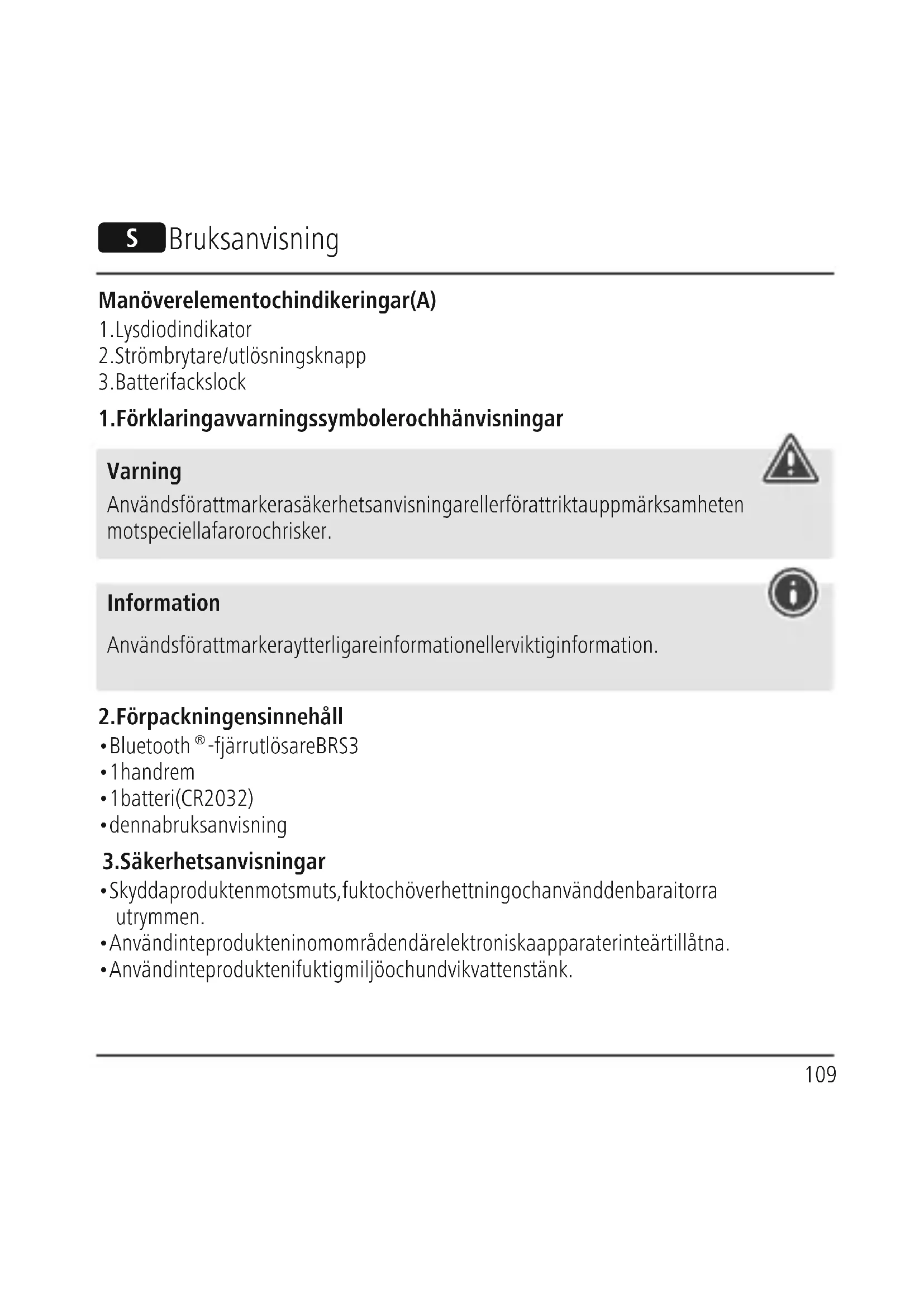 - Använd inte produkten i fuktig miljö och undvik vattenstänk. S Bruksanvisning110